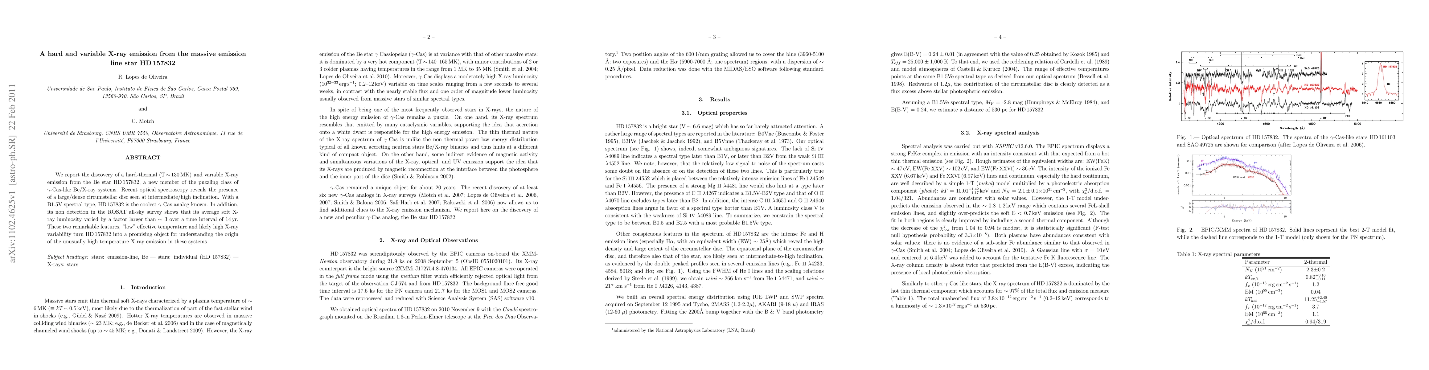 The paper reports the discovery of a hard-thermal X-ray emission from the Be star HD 157832, a gamma-Cas-like Be/X-ray system with a large circumstellar disc. Its variable X-ray emission and low effective temperature make it a key object for studying high-temperature X-ray phenomena in such systems.