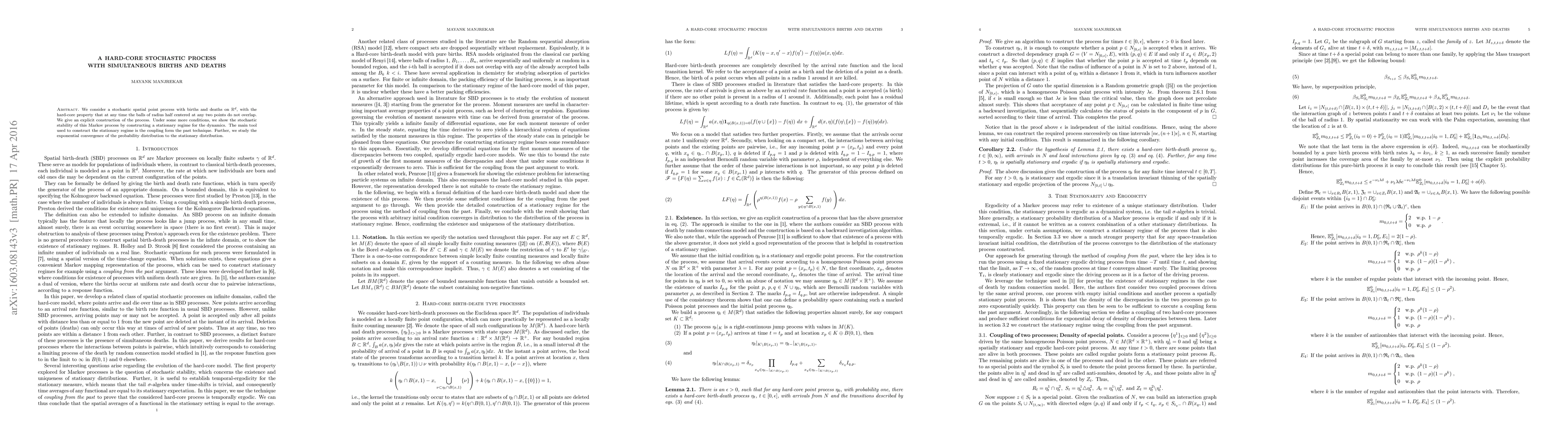 This paper constructs a stochastic spatial point process with simultaneous births and deaths on $\mathbb{R}^d$, featuring a hard-core property to prevent overlapping balls. It demonstrates the stochastic stability and exponential convergence to a stationary regime using the coupling from the past technique.