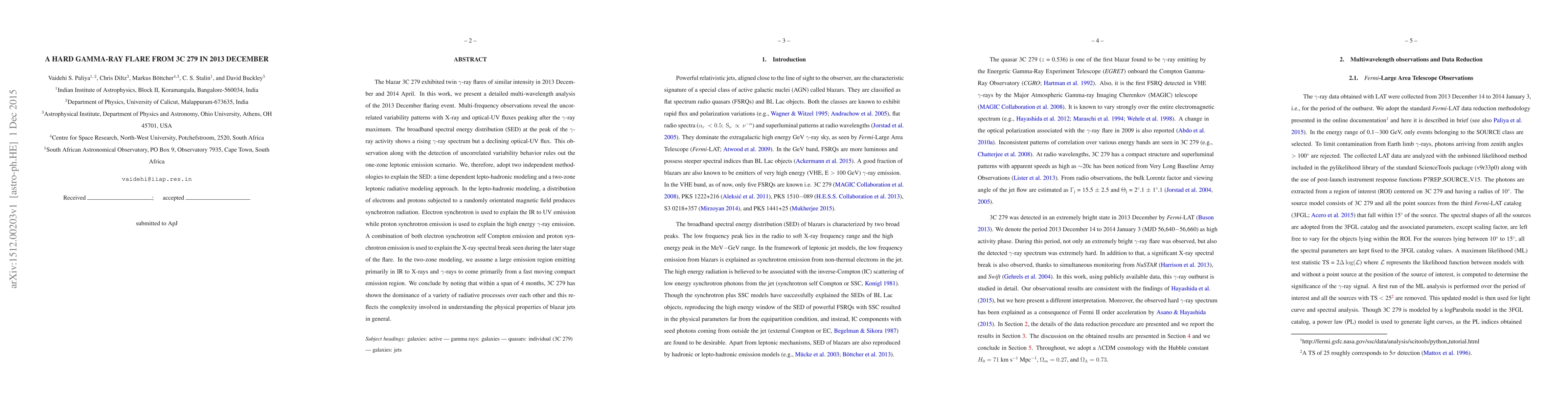 The research presents a detailed multi-wavelength analysis of a gamma-ray flare from the blazar 3C 279 in December 2013, utilizing both lepto-hadronic and two-zone leptonic radiative modeling approaches to explain the broadband spectral energy distribution (SED).