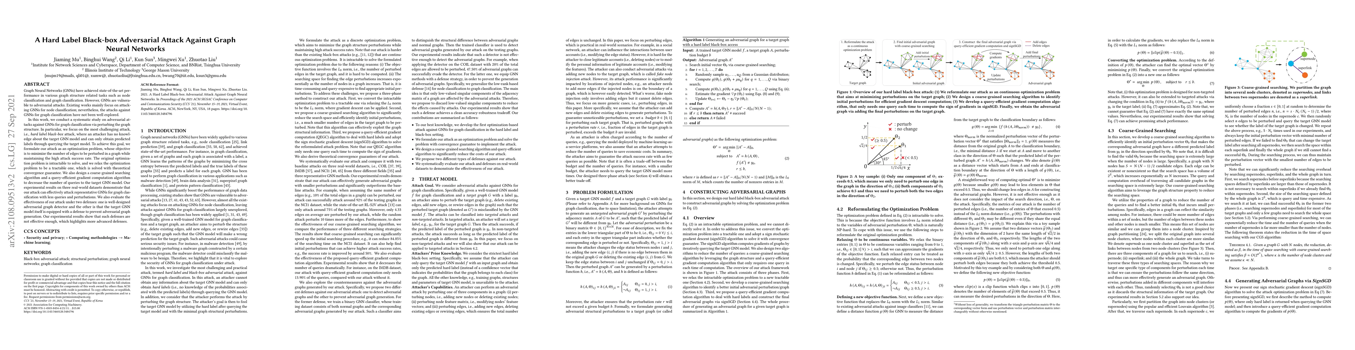 This paper presents a systematic study on adversarial attacks against graph neural networks (GNNs) for graph classification, focusing on hard label black-box attacks. The authors formulate an optimization problem to minimize edge perturbations while maintaining high attack success rates, and propose a tractable solution with theoretical convergence guarantees. Experimental results show the attack's effectiveness with fewer queries and perturbations, and reveal the ineffectiveness of existing defenses against such attacks.