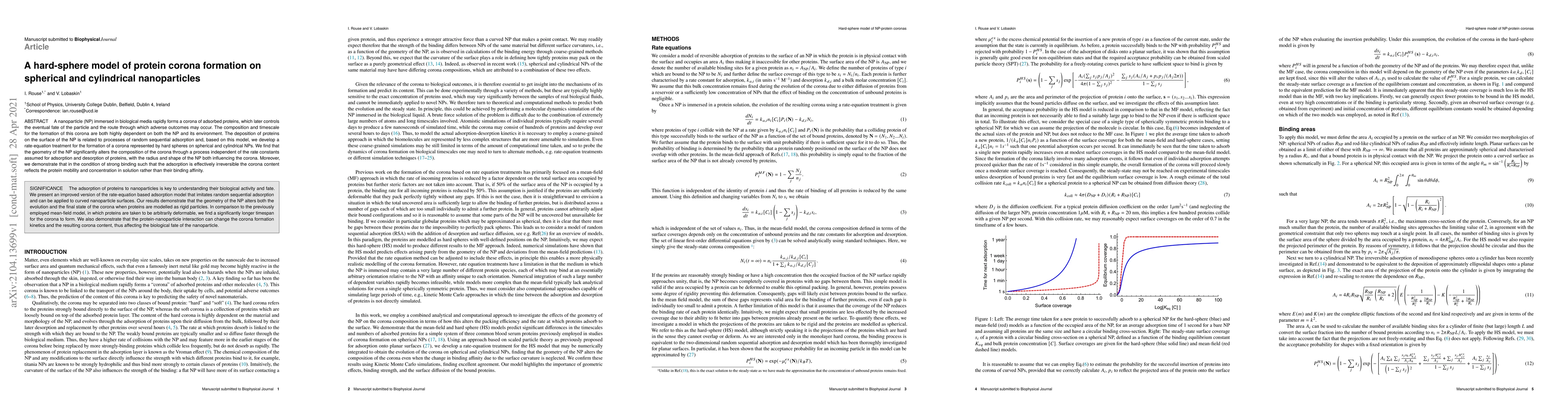 Nanoparticles form a protein corona that influences their fate, with its composition and timescale dependent on the nanoparticle's geometry and environment. The corona content reflects protein mobility and concentration rather than binding affinity under conditions of strong binding.