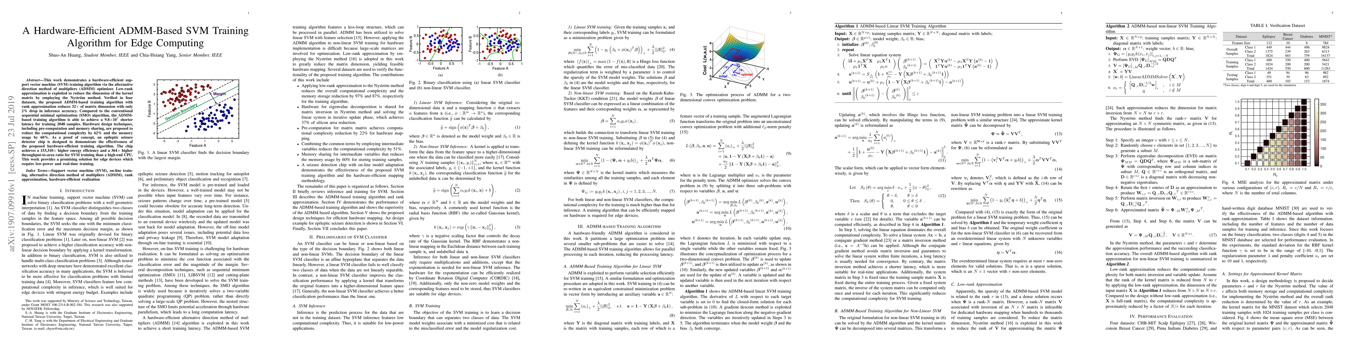 This research introduces a hardware-efficient SVM training algorithm using the ADMM optimizer with low-rank approximation, achieving 32× reduction in matrix dimension and 9.8×10^7 shorter training latency compared to SMO, while maintaining high inference accuracy. The proposed algorithm enhances energy efficiency and throughput-to-area ratio for edge computing applications.