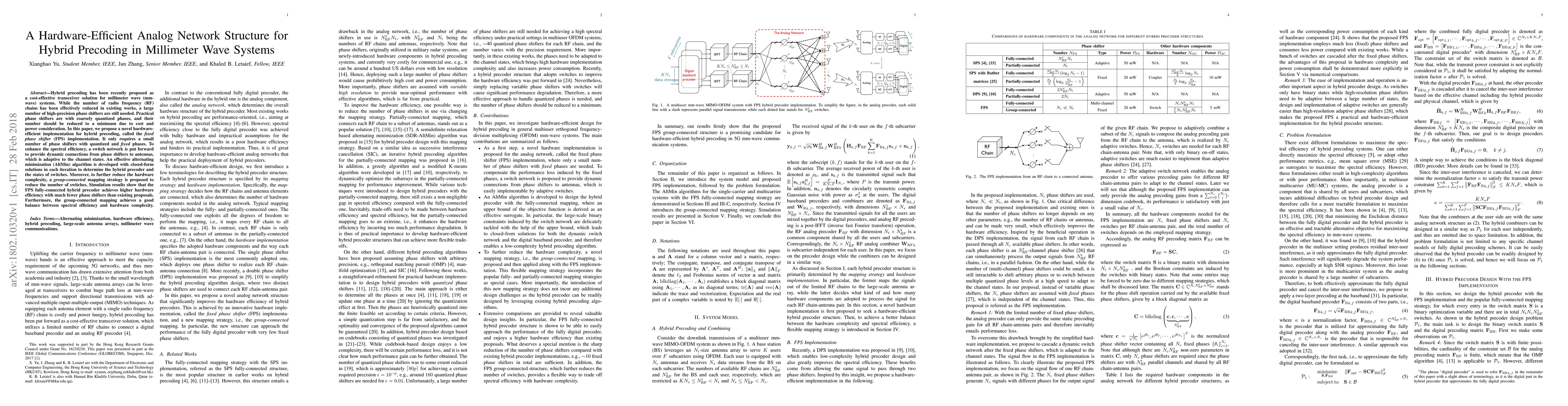 This paper proposes a novel hardware-efficient hybrid precoding structure for millimeter wave systems using a fixed phase shifter (FPS) implementation with minimal high-precision phase shifters and an adaptive switch network. An effective AltMin algorithm is developed to optimize the precoder and switch states, and a group-connected mapping strategy further reduces hardware complexity while maintaining spectral efficiency.