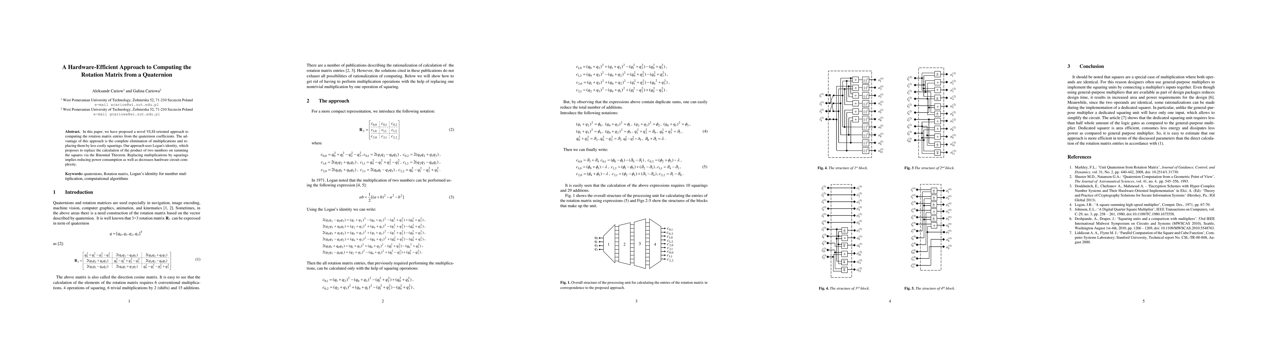 Researchers proposed a new method to calculate rotation matrices from quaternions using squarings instead of multiplications, reducing power consumption and hardware complexity.