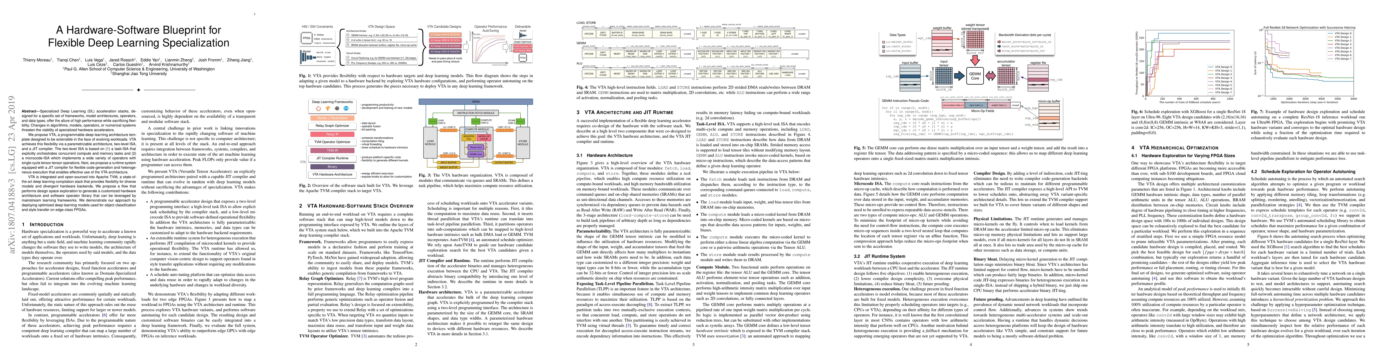 Specialized Deep Learning (DL) acceleration stacks, designed for a specific set of frameworks, model architectures, operators, and data types, offer the allure of high performance while sacrificing flexibility. Changes in algorithms, models, operators, or numerical systems threaten the viability of specialized hardware accelerators. We propose VTA, a programmable deep learning architecture template designed to be extensible in the face of evolving workloads. VTA achieves this flexibility via a parametrizable architecture, two-level ISA, and a JIT compiler. The two-level ISA is based on (1) a task-ISA that explicitly orchestrates concurrent compute and memory tasks and (2) a microcode-ISA which implements a wide variety of operators with single-cycle tensor-tensor operations. Next, we propose a runtime system equipped with a JIT compiler for flexible code-generation and heterogeneous execution that enables effective use of the VTA architecture. VTA is integrated and open-sourced into Apache TVM, a state-of-the-art deep learning compilation stack that provides flexibility for diverse models and divergent hardware backends. We propose a flow that performs design space exploration to generate a customized hardware architecture and software operator library that can be leveraged by mainstream learning frameworks. We demonstrate our approach by deploying optimized deep learning models used for object classification and style transfer on edge-class FPGAs.