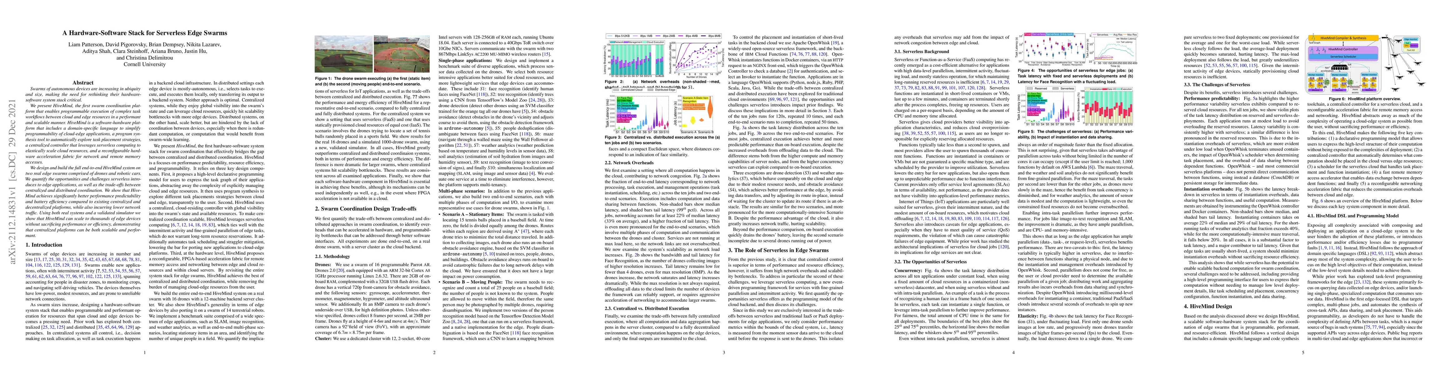The paper presents HiveMind, a hardware-software stack for edge swarms, utilizing a domain-specific language (DSL) for simplified programmability, automatic task placement synthesis, a centralized controller leveraging serverless computing, and a reconfigurable hardware acceleration fabric for network and remote memory accesses. The system is evaluated on real swarms of drones and robotic cars.