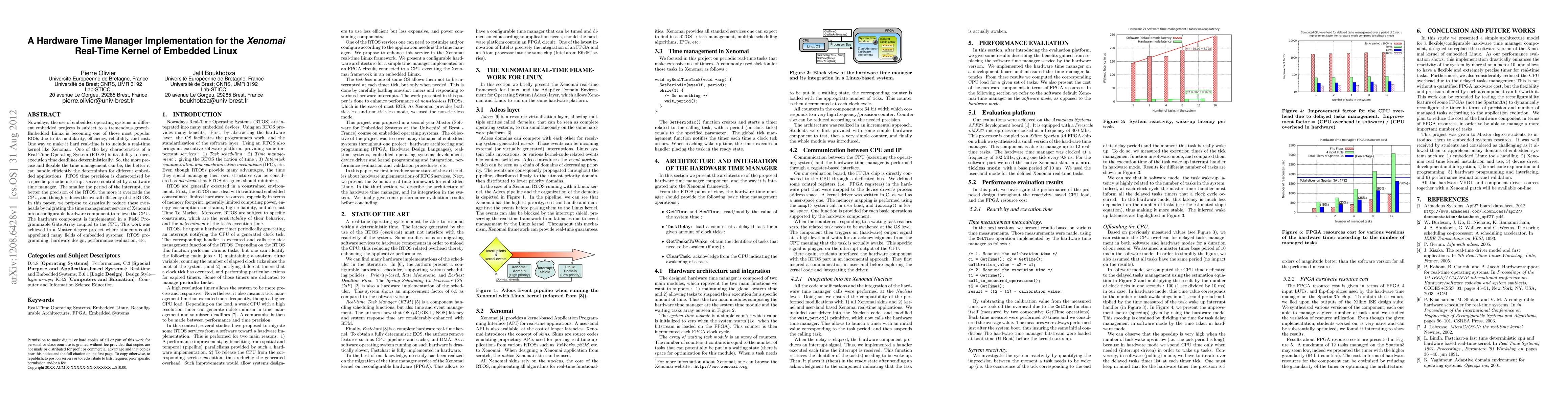 This paper proposes a hardware time manager implemented in a Field Programmable Gate Array to enhance the real-time capabilities of the Xenomai kernel in Embedded Linux, aiming to reduce CPU overhead and improve the precision and efficiency of real-time applications. The implementation was part of a Master's degree project, integrating RTOS programming, hardware design, and performance evaluation.