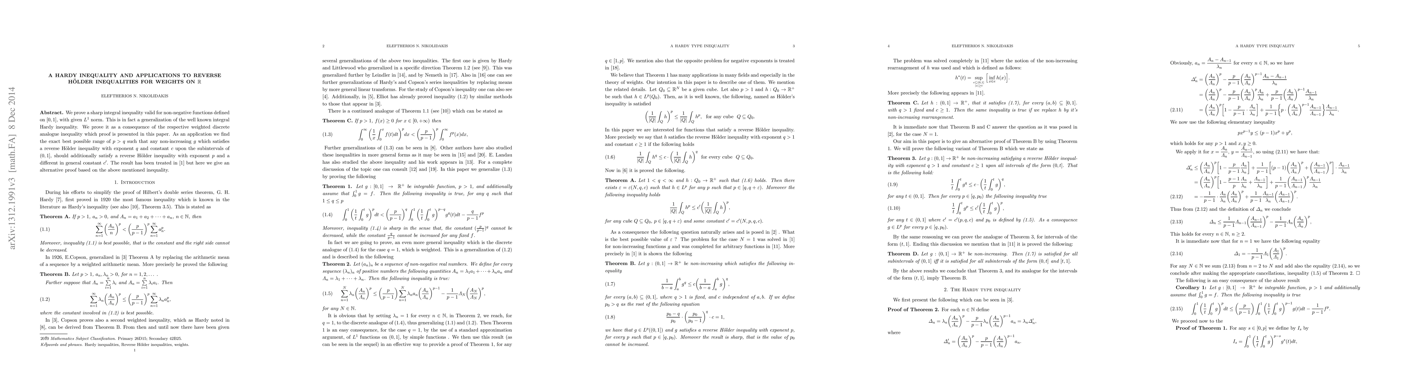 We prove a sharp integral inequality valid for non-negative functions defined on $[0,1]$, with given $L^1$ norm. This is in fact a generalization of the well known integral Hardy inequality. We prove it as a consequence of the respective weighted discrete analogue inequality which proof is presented in this paper. As an application we find the exact best possible range of $p>q$ such that any non-increasing $f$ which satisfies a reverse H\"{o}lder inequality with exponent $q$ and constant $c$ upon the subintervals of $[0,1]$, should additionally satisfy a reverse H\"{o}lder inequality with exponent $p$ and a different in general constant $c'$. The result has been treated in \cite{1} but here we give an alternative proof based on the above mentioned inequality.