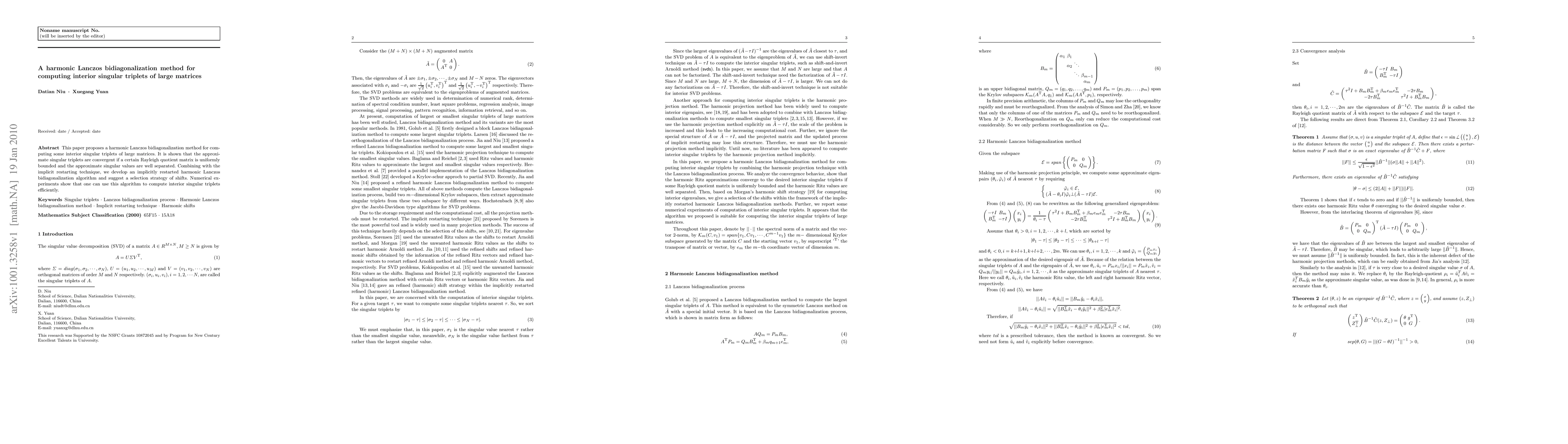 This paper proposes a harmonic Lanczos bidiagonalization method for computing interior singular triplets of large matrices, demonstrating convergence under certain conditions and developing an implicitly restarted algorithm with an effective shift selection strategy. Numerical experiments validate the efficiency of the method.