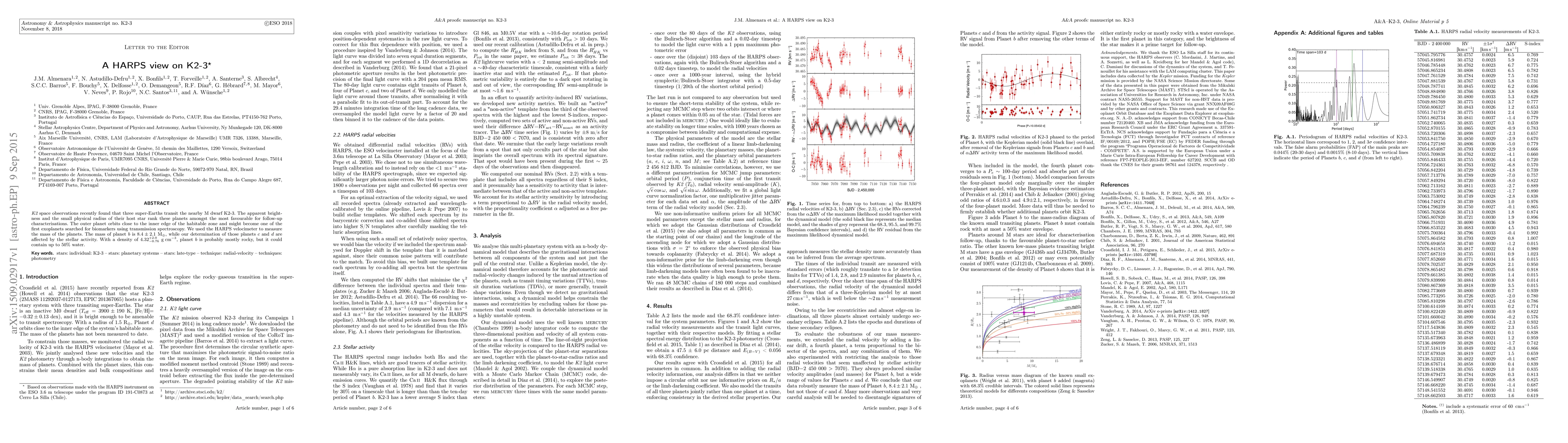 The HARPS velocimeter measured the mass of three super-Earths orbiting the M dwarf K2-3, with planet b having a mass of $8.4\pm2.1$ M$_\oplus$ and a probable rocky composition, potentially containing up to 50% water. The outer planet near the habitable zone is a prime candidate for future biomarker searches.