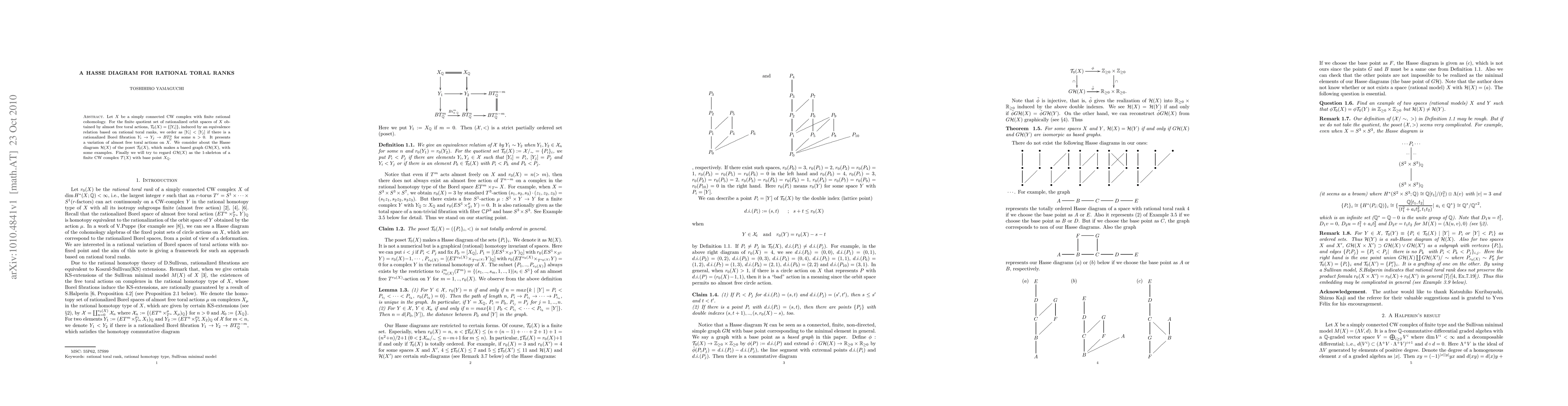 Let $X$ be a simply connected CW complex with finite rational cohomology. For the finite quotient set of rationalized orbit spaces of $X$ obtained by almost free toral actions, ${\mathcal T}_0(X)=\{[Y_i] \}$, induced by an equivalence relation based on rational toral ranks, we order as $[Y_i]<[Y_j]$ if there is a rationalized Borel fibration $Y_i\to Y_j\to BT^n_{\Q}$ for some $n>0$. It presents a variation of almost free toral actions on $X$. We consider about the Hasse diagram ${\mathcal H}(X)$ of the poset ${\mathcal T}_0(X)$, which makes a based graph $G{\mathcal H}(X)$, with some examples. Finally we will try to regard $G{\mathcal H}(X)$ as the 1-skeleton of a finite CW complex ${\mathcal T}(X)$ with base point $X_{\Q}$.