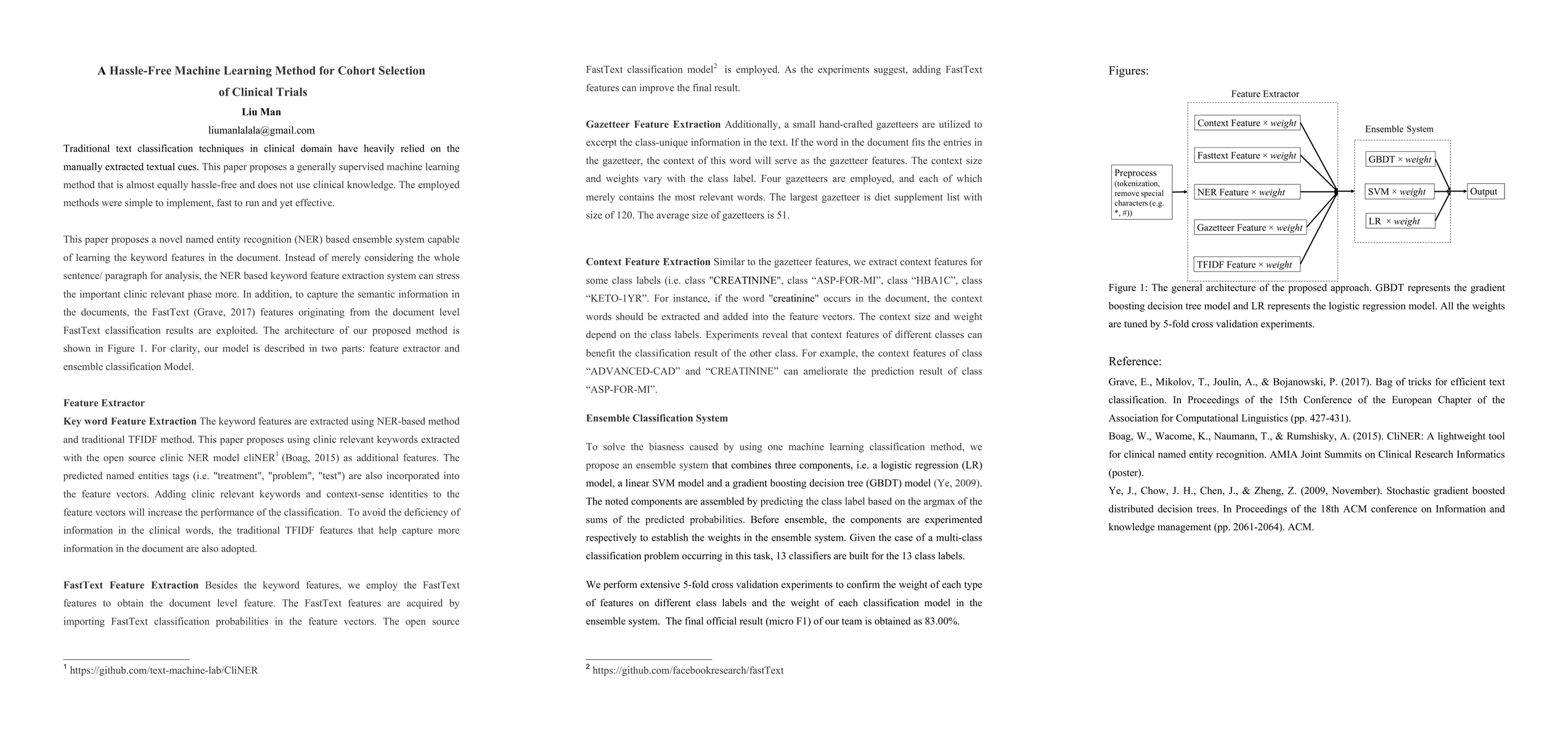 Traditional text classification techniques in clinical domain have heavily relied on the manually extracted textual cues. This paper proposes a generally supervised machine learning method that is equally hassle-free and does not use clinical knowledge. The employed methods were simple to implement, fast to run and yet effective. This paper proposes a novel named entity recognition (NER) based an ensemble system capable of learning the keyword features in the document. Instead of merely considering the whole sentence/paragraph for analysis, the NER based keyword features can stress the important clinic relevant phases more. In addition, to capture the semantic information in the documents, the FastText features originating from the document level FastText classification results are exploited.