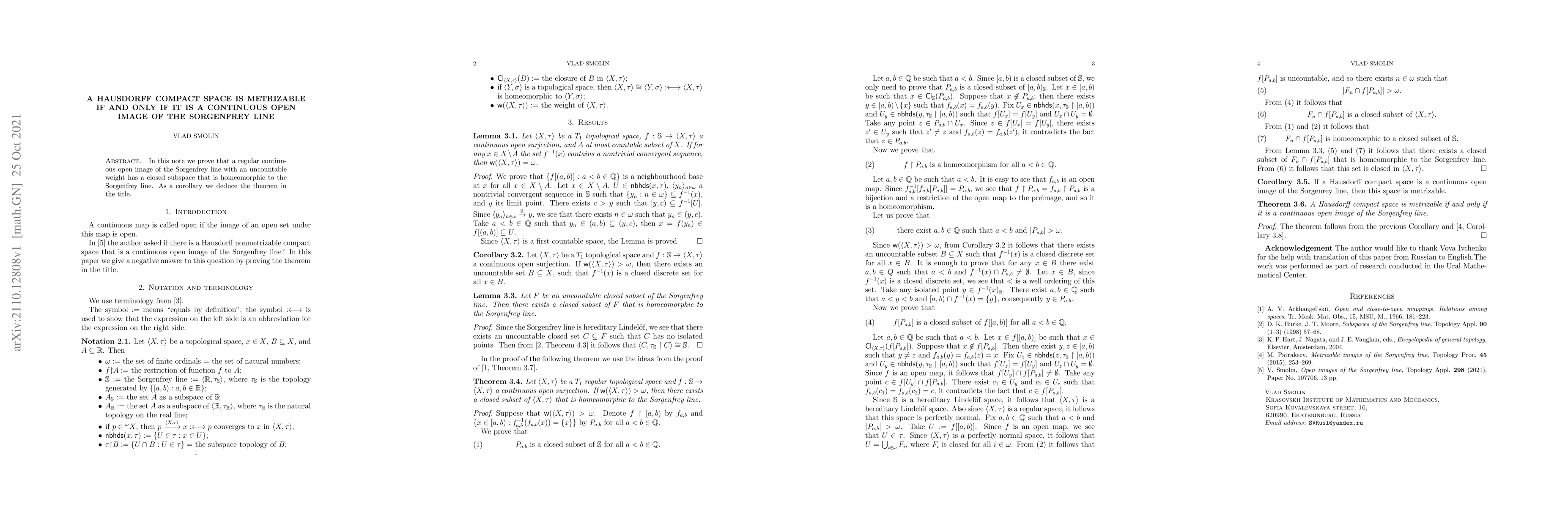 The paper proves this theorem as a corollary by showing that a regular continuous open image of the Sorgenfrey line with uncountable weight has a closed subspace homeomorphic to the Sorgenfrey line.