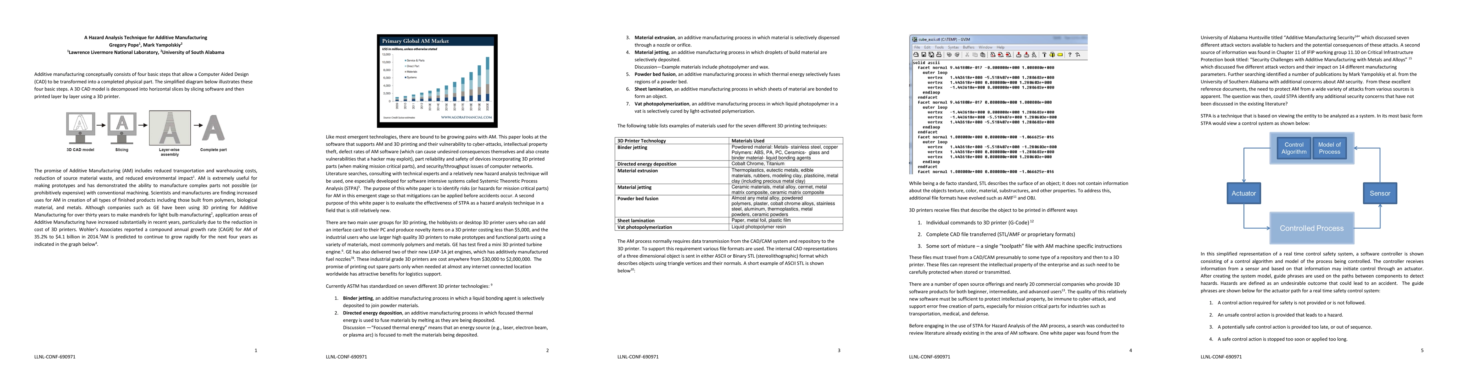 The promise of Additive Manufacturing (AM) includes reduced transportation and warehousing costs, reduction of source material waste, and reduced environmental impact. AM is extremely useful for making prototypes and has demonstrated the ability to manufacture complex parts not possible (or prohibitively expensive) with conventional machining. Scientists and manufactures are finding increased uses for AM in creation of all types of finished products including those built from polymers, biological material, and metals. Although companies such as GE have been using 3D printing for Additive Manufacturing for over thirty years to make mandrels for light bulb manufacturing, application areas of Additive Manufacturing have increased substantially in recent years, particularly due to the reduction in cost of 3D printers. Like most emergent technologies, there are bound to be growing pains with AM. This paper looks at the software that supports AM and 3D printing and their vulnerability to cyber-attacks, intellectual property theft, defect rates of AM software (which can cause undesired consequences themselves and also create vulnerabilities that a hacker may exploit), part reliability and safety of devices incorporating 3D printed parts (when making mission critical parts), and security/throughput issues of computer networks. Literature searches, consulting with technical experts and a relatively new hazard analysis technique will be used, one especially developed for software intensive systems called Systemic Theoretic Process Analysis (STPA). The purpose of this white paper is to identify risks (or hazards for mission critical parts) for AM in this emergent stage so that mitigations can be applied before accidents occur. A second purpose of this white paper is to evaluate the effectiveness of STPA as a hazard analysis technique in a field that is still relatively new.