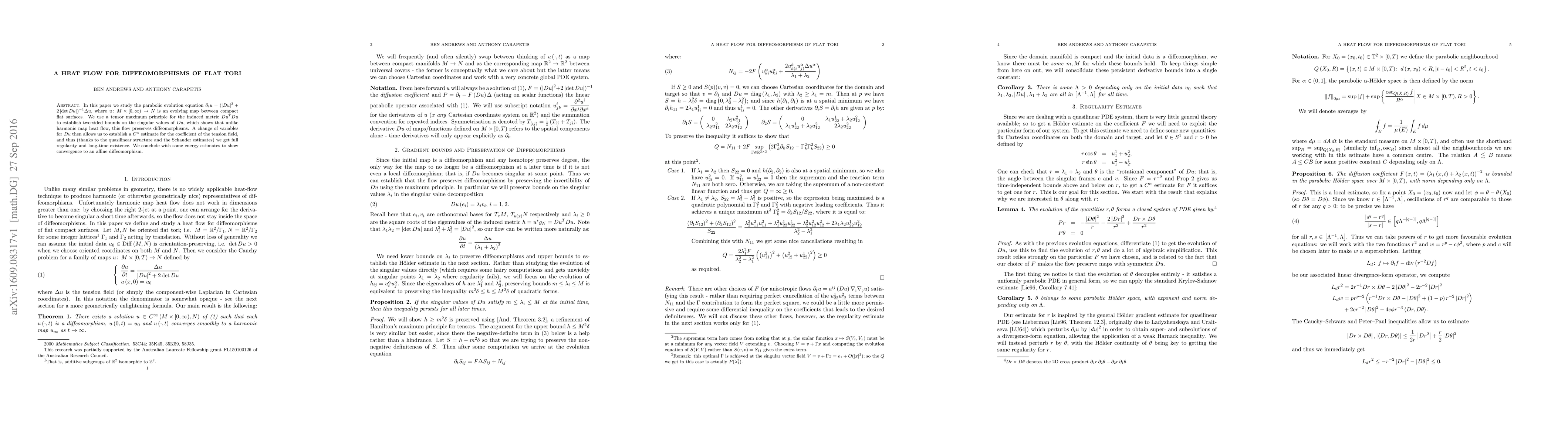 In this paper we study the parabolic evolution equation $\partial_t u=(|Du|^{2}+2|\det Du|)^{-1} \Delta u$, where $u : M\times[0,\infty) \to N$ is an evolving map between compact flat surfaces. We use a tensor maximum principle for the induced metric to establish two-sided bounds on the singular values of Du, which shows that unlike harmonic map heat flow, this flow preserves diffeomorphisms. A change of variables for Du then allows us to establish a $C^\alpha$ estimate for the coefficient of the tension field, and thus (thanks to the quasilinear structure and the Schauder estimates) we get full regularity and long-time existence. We conclude with some energy estimates to show convergence to an affine diffeomorphism.