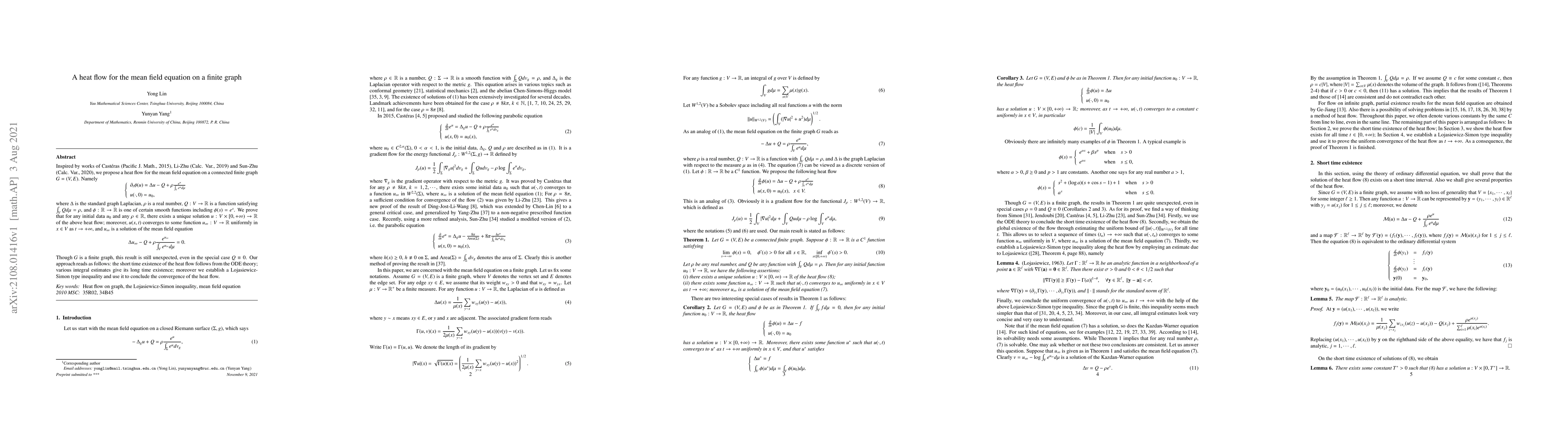 Inspired by works of Cast\'eras (Pacific J. Math., 2015), Li-Zhu (Calc. Var., 2019) and Sun-Zhu (Calc. Var., 2020), we propose a heat flow for the mean field equation on a connected finite graph $G=(V,E)$. Namely $$ \left\{\begin{array}{lll} \partial_t\phi(u)=\Delta u-Q+\rho \frac{e^u}{\int_Ve^ud\mu}\\[1.5ex] u(\cdot,0)=u_0, \end{array}\right. $$ where $\Delta$ is the standard graph Laplacian, $\rho$ is a real number, $Q:V\rightarrow\mathbb{R}$ is a function satisfying $\int_VQd\mu=\rho$, and $\phi:\mathbb{R}\rightarrow\mathbb{R}$ is one of certain smooth functions including $\phi(s)=e^s$. We prove that for any initial data $u_0$ and any $\rho\in\mathbb{R}$, there exists a unique solution $u:V\times[0,+\infty)\rightarrow\mathbb{R}$ of the above heat flow; moreover, $u(x,t)$ converges to some function $u_\infty:V\rightarrow\mathbb{R}$ uniformly in $x\in V$ as $t\rightarrow+\infty$, and $u_\infty$ is a solution of the mean field equation $$\Delta u_\infty-Q+\rho\frac{e^{u_\infty}}{\int_Ve^{u_\infty}d\mu}=0.$$ Though $G$ is a finite graph, this result is still unexpected, even in the special case $Q\equiv 0$. Our approach reads as follows: the short time existence of the heat flow follows from the ODE theory; various integral estimates give its long time existence; moreover we establish a Lojasiewicz-Simon type inequality and use it to conclude the convergence of the heat flow.