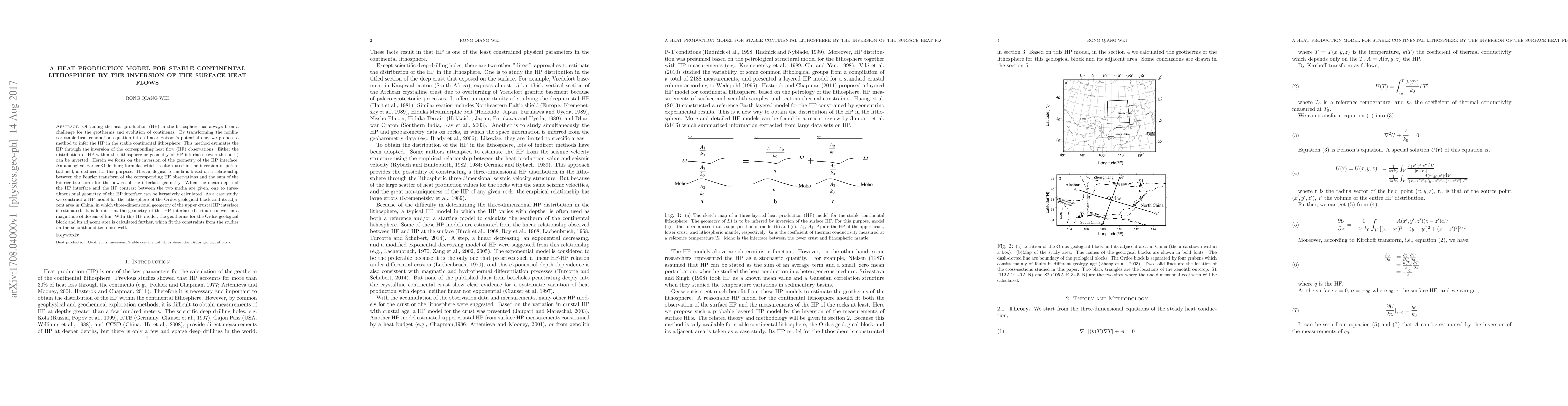 Obtaining the heat production (HP) in the lithosphere has always been a challenge for the geotherms and evolution of continents. By transforming the nonlinear stable heat conduction equation into a linear Poisson's potential one, we propose a method to infer the HP in the stable continental lithosphere. This method estimates the HP through the inversion of the corresponding heat flow (HF) observations. Either the distribution of HP within the lithosphere or geometry of HP interfaces (even the both) can be inverted. Herein we focus on the inversion of the geometry of the HP interface. An analogical Parker-Oldenburg formula, which is often used in the inversion of potential field, is deduced for this purpose. This analogical formula is based on a relationship between the Fourier transform of the corresponding HF observations and the sum of the Fourier transform for the powers of the interface geometry. When the mean depth of the HP interface and the HP contrast between the two media are given, one to three-dimensional geometry of the HP interface can be iteratively calculated. As a case study, we construct a HP model for the lithosphere of the Ordos geological block and its adjacent area in China, in which three-dimensional geometry of the upper crustal HP interface is estimated. It is found that the geometry of this HP interface distribute uneven in a magnitude of dozens of km. With this HP model, the geotherms for the Ordos geological block and its adjacent area is calculated further, which fit the constraints from the studies on the xenolith and tectonics well.