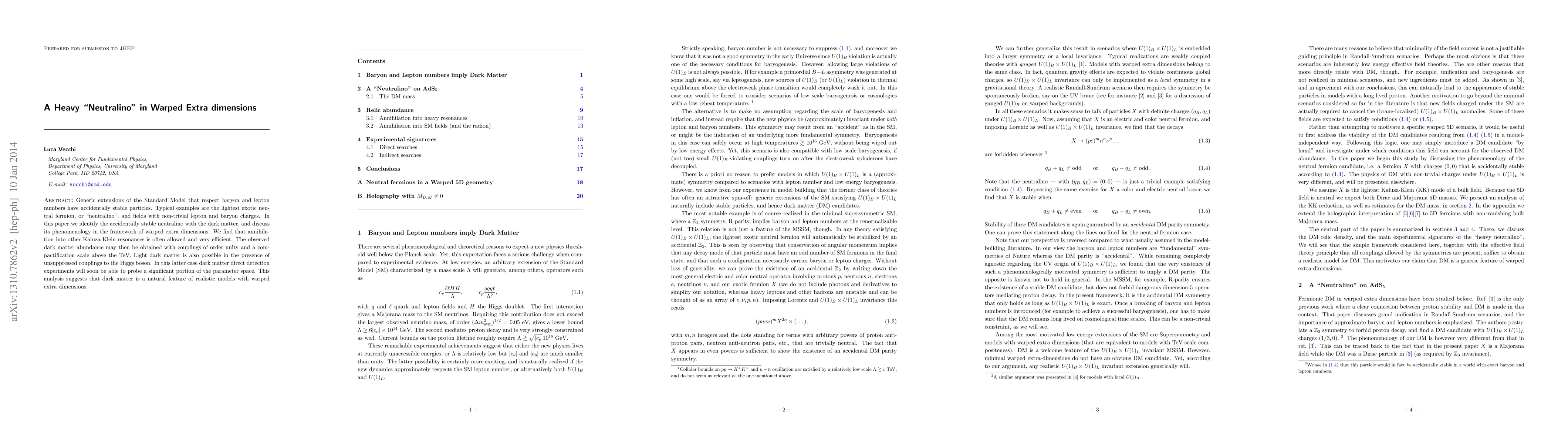 Generic extensions of the Standard Model that respect baryon and lepton numbers have accidentally stable particles. Typical examples are the lightest exotic neutral fermion, or "neutralino", and fields with non-trivial lepton and baryon charges. In this paper we show that an accidentally stable neutralino is a natural dark matter candidate in models with warped extra dimensions. We find that annihilation into other Kaluza-Klein resonances is often allowed and very efficient. The observed dark matter abundance may then be obtained with couplings of order unity and a compactification scale above the TeV. Light dark matter is also possible in the presence of unsuppressed couplings to the Higgs boson. In this latter case direct detection experiments will soon be able to probe a significant portion of the parameter space.
