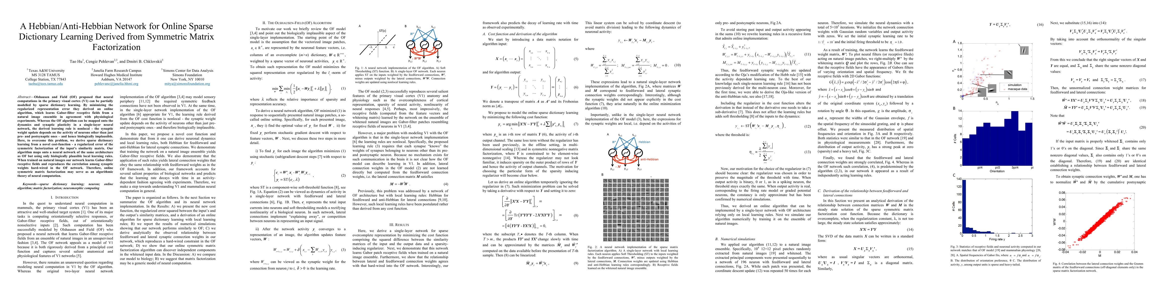 This paper proposes a Hebbian/Anti-Hebbian network for online sparse dictionary learning derived from symmetric matrix factorization, offering a biologically plausible local learning rule that maps onto neural computations in the primary visual cortex. The new algorithm learns Gabor-filter receptive fields and reproduces synaptic weight correlations, suggesting symmetric matrix factorization as a potential theory of neural computation.