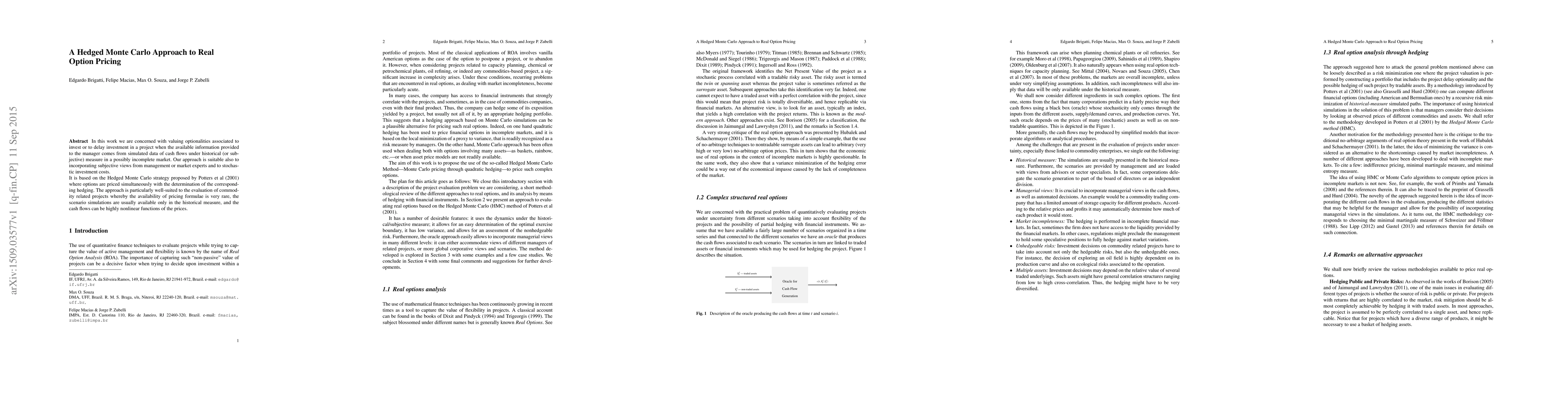In this work we are concerned with valuing optionalities associated to invest or to delay investment in a project when the available information provided to the manager comes from simulated data of cash flows under historical (or subjective) measure in a possibly incomplete market. Our approach is suitable also to incorporating subjective views from management or market experts and to stochastic investment costs. It is based on the Hedged Monte Carlo strategy proposed by Potters et al (2001) where options are priced simultaneously with the determination of the corresponding hedging. The approach is particularly well-suited to the evaluation of commodity related projects whereby the availability of pricing formulae is very rare, the scenario simulations are usually available only in the historical measure, and the cash flows can be highly nonlinear functions of the prices.
