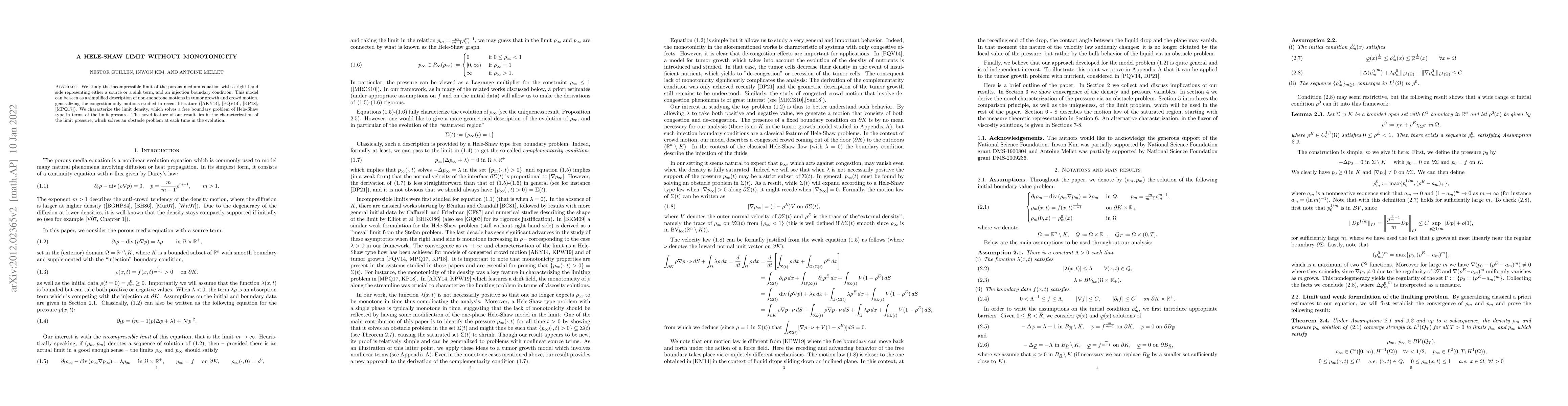 This paper investigates the incompressible limit of the porous medium equation with non-monotonic terms, modeling non-congestion phenomena in tumor growth and crowd motion. It characterizes the limit density and pressure, solving a Hele-Shaw type free boundary problem and an obstacle problem, respectively.