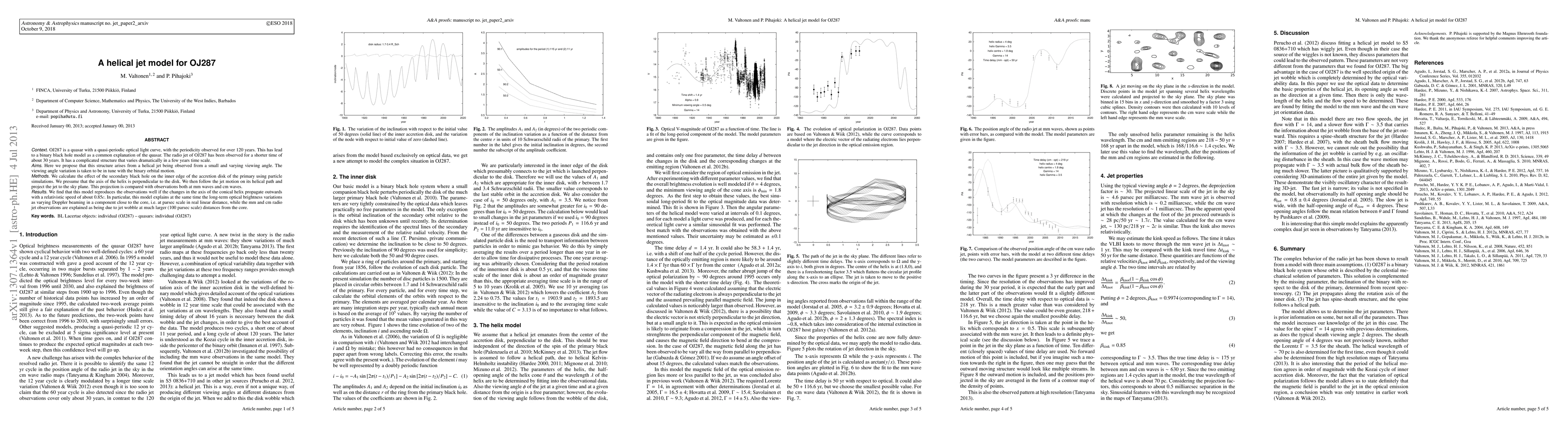 A new model proposes that OJ287's quasar structure is created by a helical jet viewed from a changing angle, explaining long-term brightness variations and radio jet observations through relativistic speed and wobble effects.