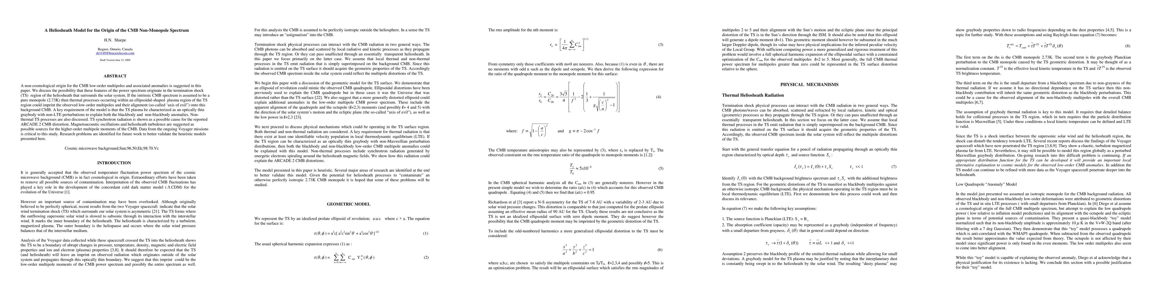 This paper proposes a heliosheath model suggesting non-cosmological origins for the CMB's low-order multipoles and anomalies, attributing these features to thermal processes in the solar system's termination shock region. The model requires the TS plasma to be an optically thin graybody with non-LTE perturbations to explain observed anomalies.