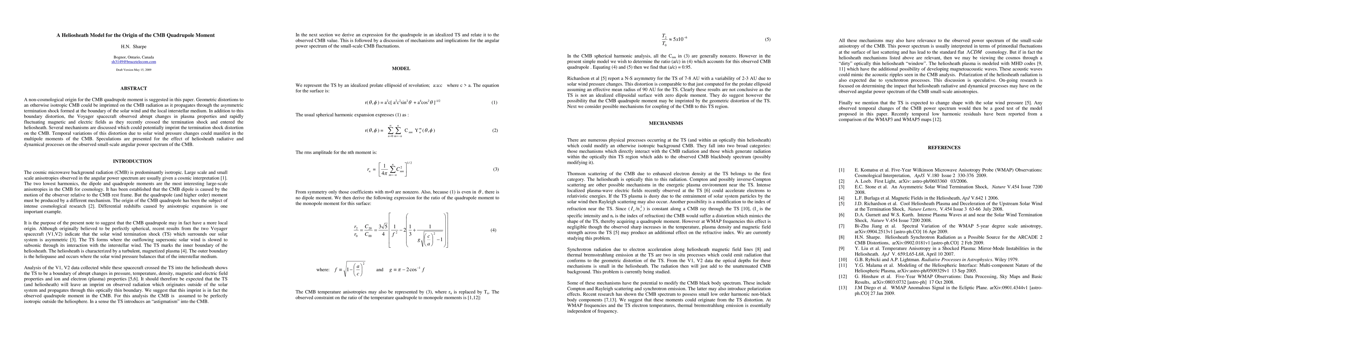 A non-cosmological origin for the CMB quadrupole moment is suggested in this paper. Geometric distortions to an otherwise isotropic CMB could be imprinted on the CMB radiation as it propagates through the asymmetric termination shock formed at the boundary of the solar wind and the local interstellar medium. In addition to this boundary distortion, the Voyager spacecraft observed abrupt changes in plasma properties and rapidly fluctuating magnetic and electric fields as they recently crossed the termination shock and entered the heliosheath. Several mechanisms are discussed which could potentially imprint the termination shock distortion on the CMB. Temporal variations of this distortion due to solar wind pressure wind changes could manifest in the multipole moments of the CMB. Speculations are presented for the effect of heliosheath radiative and dynamical processes on the observed small-scale angular power spectrum of the CMB.