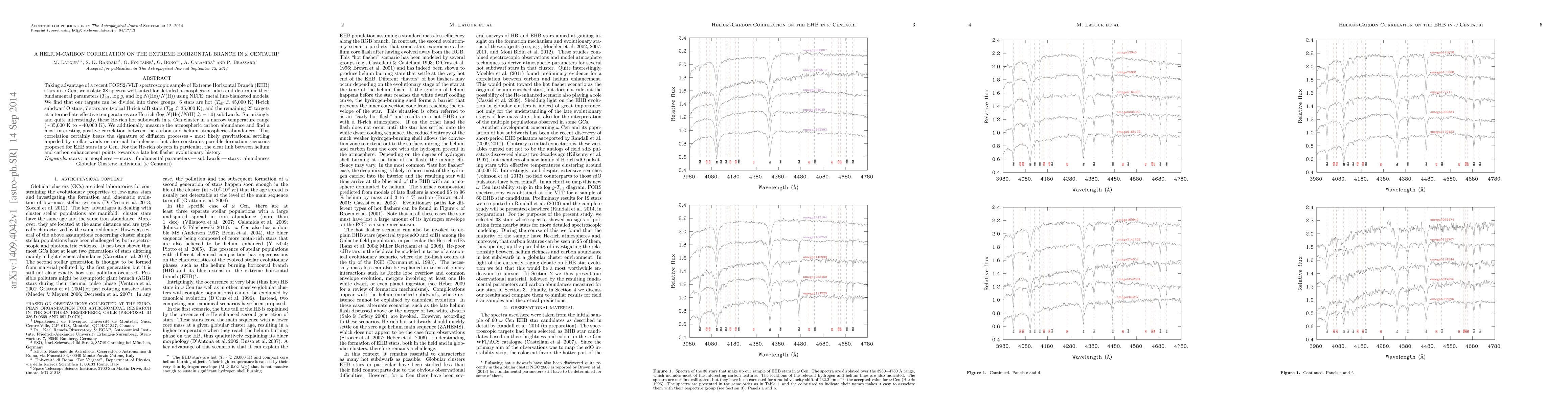Taking advantage of a recent FORS2/VLT spectroscopic sample of Extreme Horizontal Branch (EHB) stars in $\omega$ Cen, we isolate 38 spectra well suited for detailed atmospheric studies and determine their fundamental parameters ($T_{\rm eff}$, log $g$, and log $N$(He)/$N$(H)) using NLTE, metal line-blanketed models. We find that our targets can be divided into three groups: 6 stars are hot ($T_{\rm eff}$$\buildrel>\over\sim\ $ 45,000 K) H-rich subdwarf O stars, 7 stars are typical H-rich sdB stars ($T_{\rm eff}$$ \buildrel<\over\sim\ $35,000 K), and the remaining 25 targets at intermediate effective temperatures are He-rich (log $N$(He)/$N$(H)$ \buildrel>\over\sim\ $ $-$1.0) subdwarfs. Surprisingly and quite interestingly, these He-rich hot subdwarfs in $\omega$ Cen cluster in a narrow temperature range ($\sim$35,000 K to $\sim$40,000 K). We additionally measure the atmospheric carbon abundance and find a most interesting positive correlation between the carbon and helium atmospheric abundances. This correlation certainly bears the signature of diffusion processes - most likely gravitational settling impeded by stellar winds or internal turbulence - but also constrains possible formation scenarios proposed for EHB stars in $\omega$ Cen. For the He-rich objects in particular, the clear link between helium and carbon enhancement points towards a late hot flasher evolutionary history.