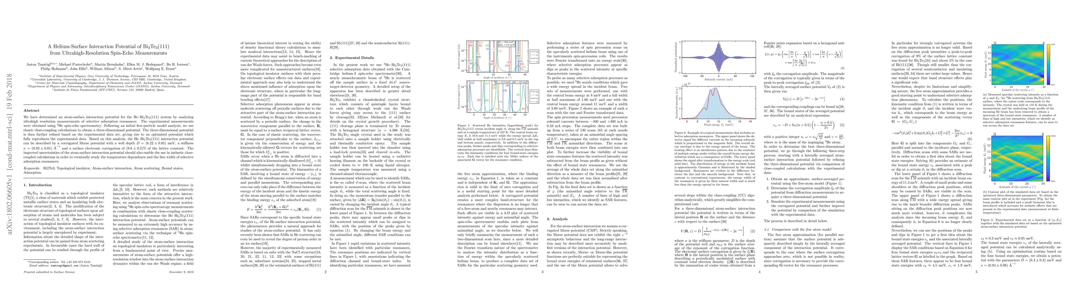 This study determines a helium-Bi$_2$Te$_3$(111) interaction potential using ultrahigh-resolution spin-echo measurements, revealing a corrugated Morse potential with precise parameters and enabling further inelastic calculations. The refined potential model achieves full agreement with experimental data and reduces uncertainties.