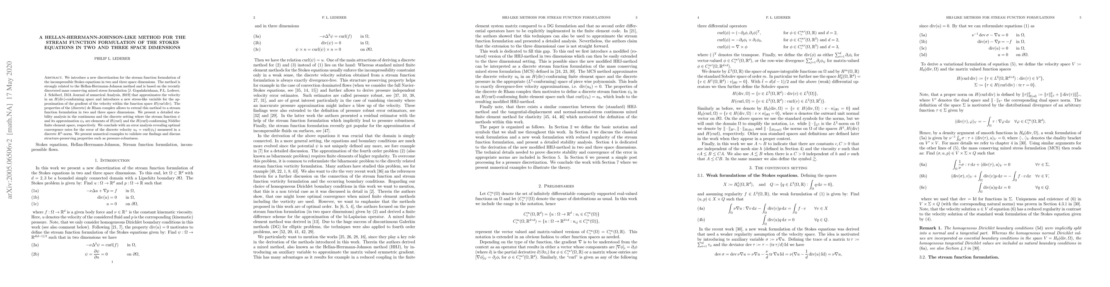 We introduce a new discretization for the stream function formulation of the incompressible Stokes equations in two and three space dimensions. The method is strongly related to the Hellan-Herrmann-Johnson method and is based on the recently discovered mass conserving mixed stress formulation [J. Gopalakrishnan, P.L. Lederer, J. Sch\"oberl, IMA Journal of numerical Analysis, 2019] that approximates the velocity in an $H(\operatorname{div})$-conforming space and introduces a new stress-like variable for the approximation of the gradient of the velocity within the function space $H(\operatorname{curl}\operatorname{div})$. The properties of the (discrete) de Rham complex allows to extend this method to a stream function formulation in two and three space dimensions. We present a detailed stability analysis in the continuous and the discrete setting where the stream function $\psi$ and its approximation $\psi_h$ are elements of $H(\operatorname{curl})$ and the $H(\operatorname{curl})$-conforming N\'ed\'elec finite element space, respectively. We conclude with an error analysis revealing optimal convergence rates for the error of the discrete velocity $u_h = \operatorname{curl}(\psi_h)$ measured in a discrete $H^1$-norm. We present numerical examples to validate our findings and discuss structure-preserving properties such as pressure-robustness.