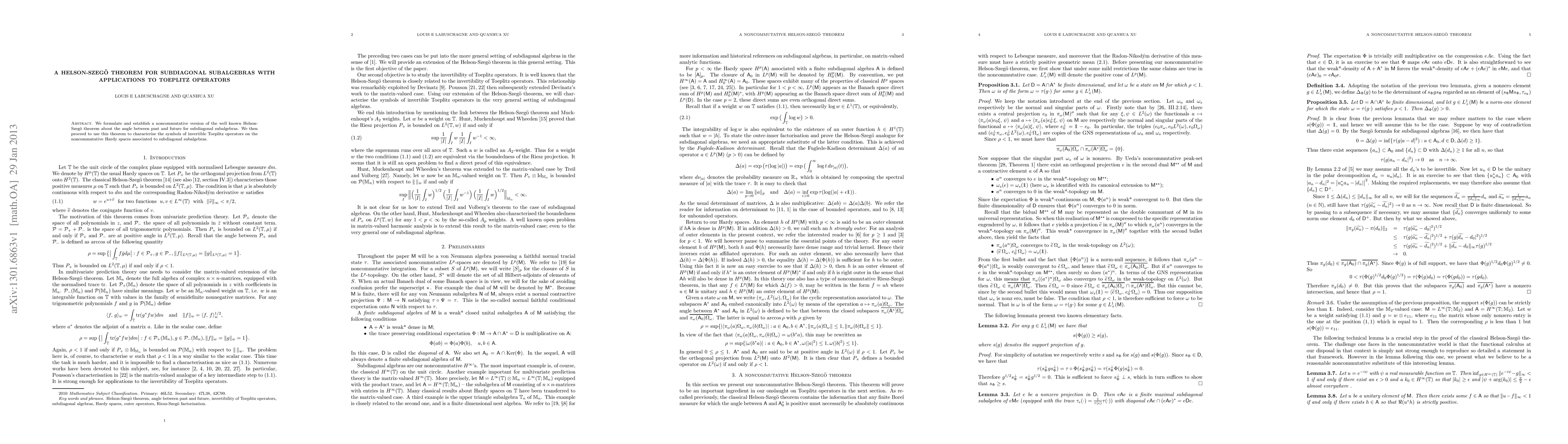 We formulate and establish a noncommutative version of the well known Helson-Szego theorem about the angle between past and future for subdiagonal subalgebras. We then proceed to use this theorem to characterise the symbols of invertible Toeplitz operators on the noncommutative Hardy spaces associated to subdiagonal subalgebras.