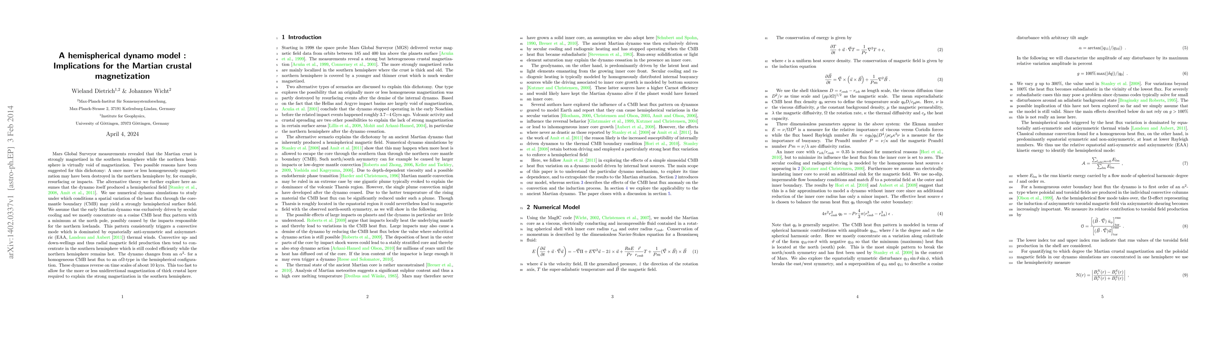 Mars Global Surveyor measurements revealed that the Martian crust is strongly magnetized in the southern hemisphere while the northern hemisphere is virtually void of magnetization. Two possible reasons have been suggested for this dichotomy: A once more or less homogeneously magnetization may have been destroyed in the northern hemisphere by, for example, resurfacing or impacts. The alternative theory we further explore here assumes that the dynamo itself produced a hemispherical field. We use numerical dynamo simulations to study under which conditions a spatial variation of the heat flux through the core-mantle boundary (CMB) may yield a strongly hemispherical surface field. We assume that the early Martian dynamo was exclusively driven by secular cooling and we mostly concentrate on a cosine CMB heat flux pattern with a minimum at the north pole, possibly caused by the impacts responsible for the northern lowlands. This pattern consistently triggers a convective mode which is dominated by equatorially anti-symmetric and axisymmetric (EAA) thermal winds. Convective up- and down-wellings and thus radial magnetic field production then tend to concentrate in the southern hemisphere which is still cooled efficiently while the northern hemisphere remains hot. The dynamo changes from an alpha^2- for a homogeneous CMB heat flux to an alpha-Omega-type in the hemispherical configuration. These dynamos reverse on time scales of about 10 kyrs. This too fast to allow for the more or less unidirectional magnetization of thick crustal layer required to explain the strong magnetization in the southern hemisphere.