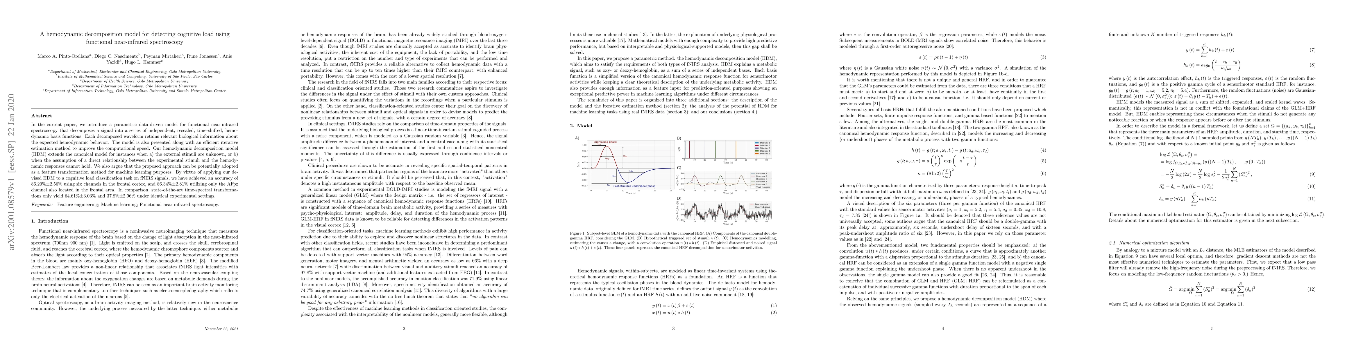 This paper introduces a hemodynamic decomposition model for functional near-infrared spectroscopy (fNIRS) that decomposes signals into hemodynamic basis functions for cognitive load detection. The model achieves high accuracy (86.20%±2.56%) in classifying cognitive load, outperforming existing methods.