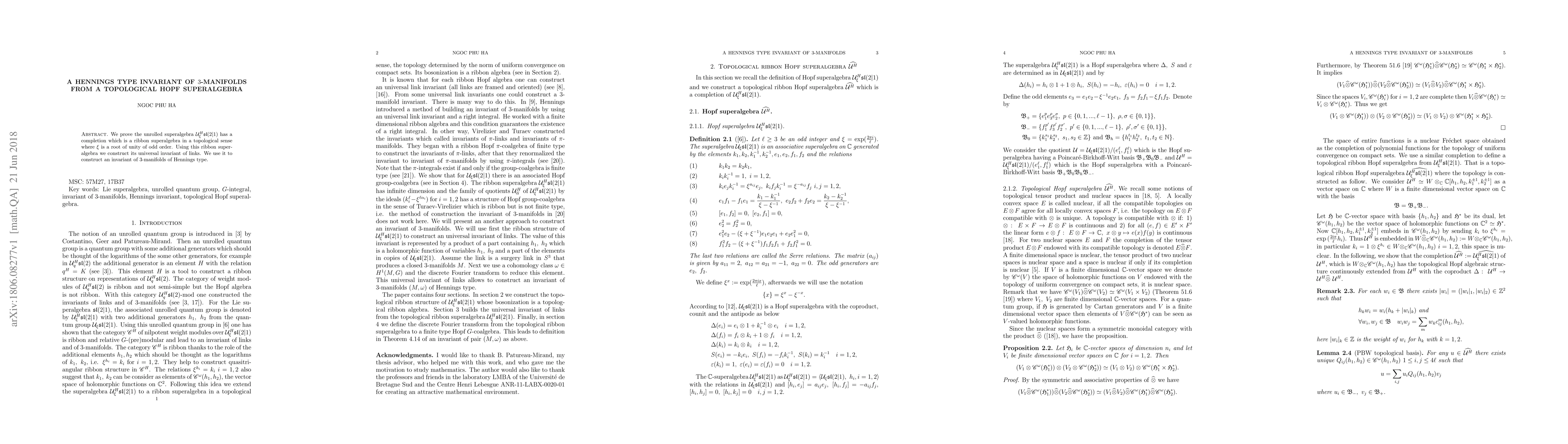 We prove the unrolled superalgebra $\mathcal{U}_{\xi}^{H}\mathfrak{sl}(2|1)$ has a completion which is a ribbon superalgebra in a topological sense where $\xi$ is a root of unity of odd order. Using this ribbon superalgebra we construct its universal invariant of links. We use it to construct an invariant of $3$-manifolds of Hennings type.