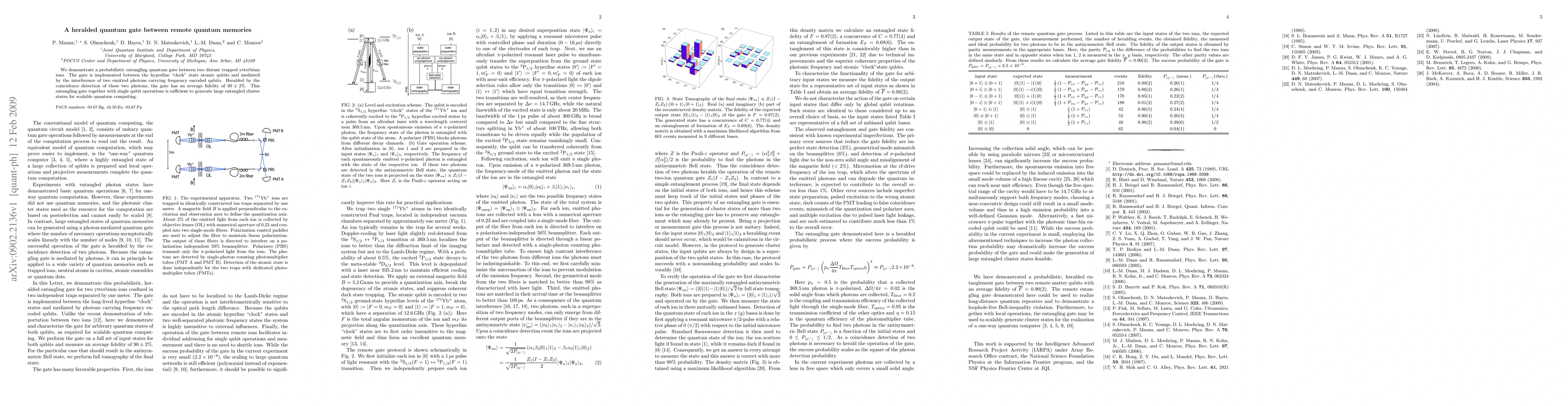 This paper demonstrates a probabilistic entangling quantum gate between two remote trapped ytterbium ions, mediated by photon interference, achieving an average fidelity of 90±2%. The gate, combined with single qubit operations, can generate large entangled cluster states for scalable quantum computing.