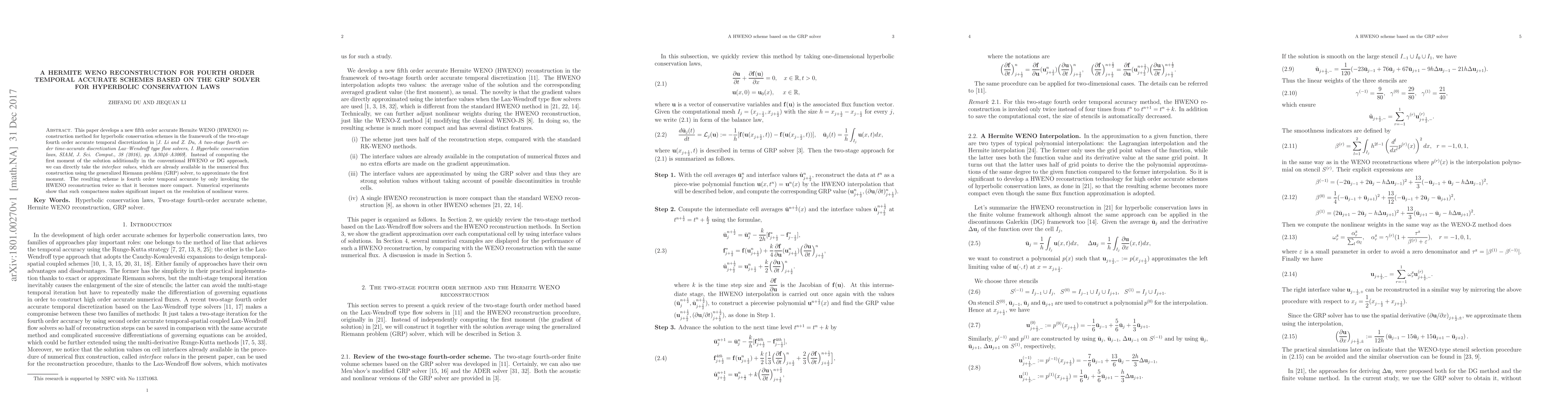 This paper introduces a fifth-order accurate Hermite WENO (HWENO) reconstruction method for hyperbolic conservation laws, enhancing a two-stage fourth-order temporal discretization scheme. By directly using interface values from the generalized Riemann problem solver, the method achieves temporal accuracy without additional computational cost, improving the resolution of nonlinear waves.