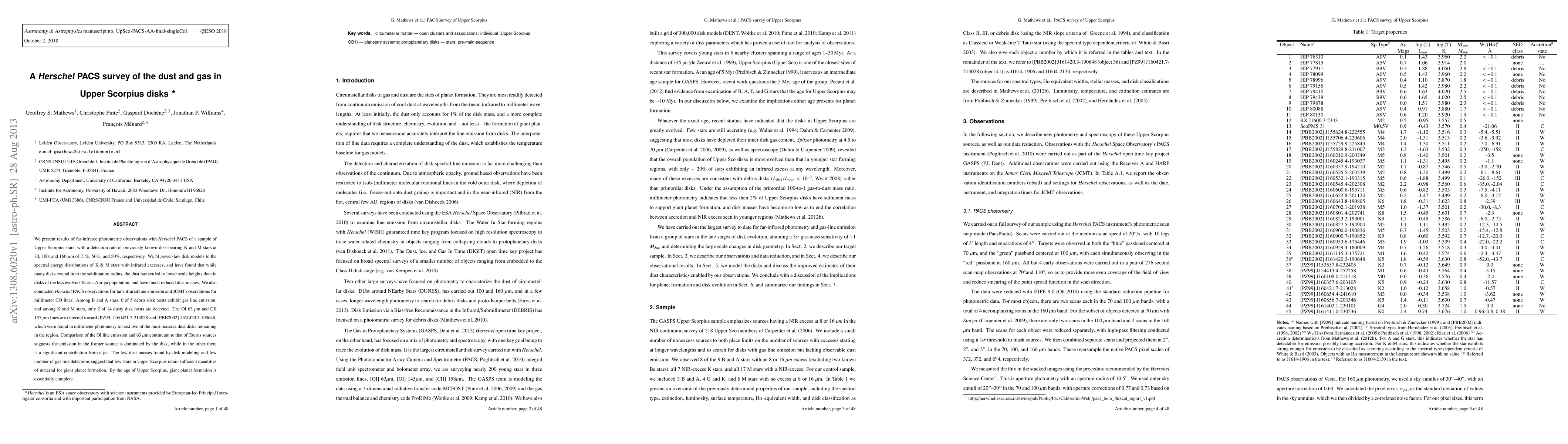 This study uses Herschel PACS observations to analyze the dust and gas in Upper Scorpius disks, finding reduced dust masses and lower scale heights compared to Taurus-Auriga disks. Only a few gas line emissions are detected, suggesting that giant planet formation is nearly complete in Upper Scorpius.