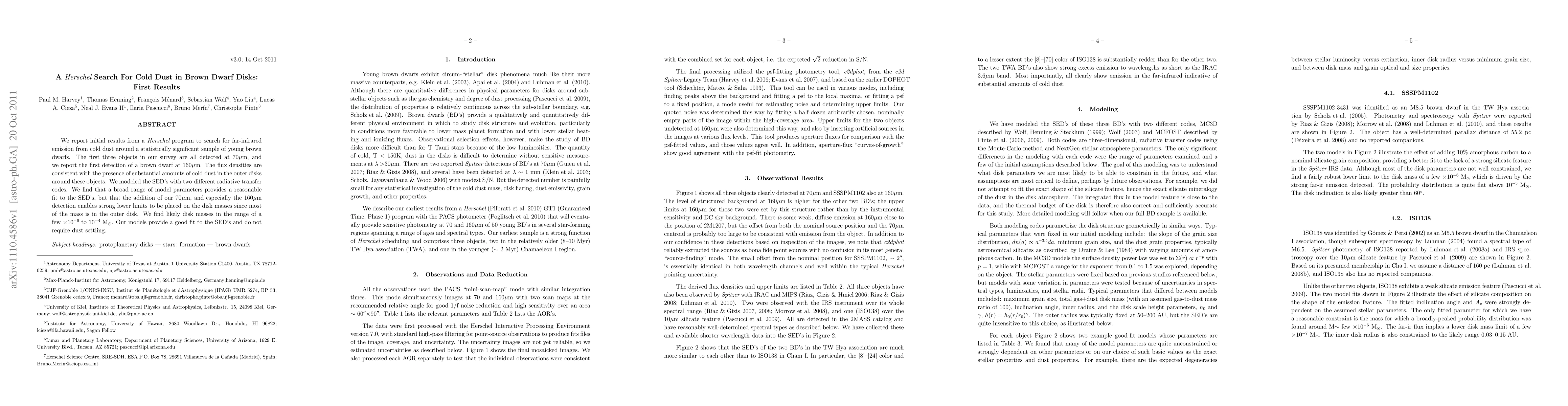 This Herschel study detected far-infrared emission from cold dust around young brown dwarfs, indicating substantial amounts of dust in their outer disks. The findings suggest disk masses ranging from a few $\times 10^{-6}$ to $10^{-4}$ \msun, with the 160\micron detection providing strong lower limits on disk mass.