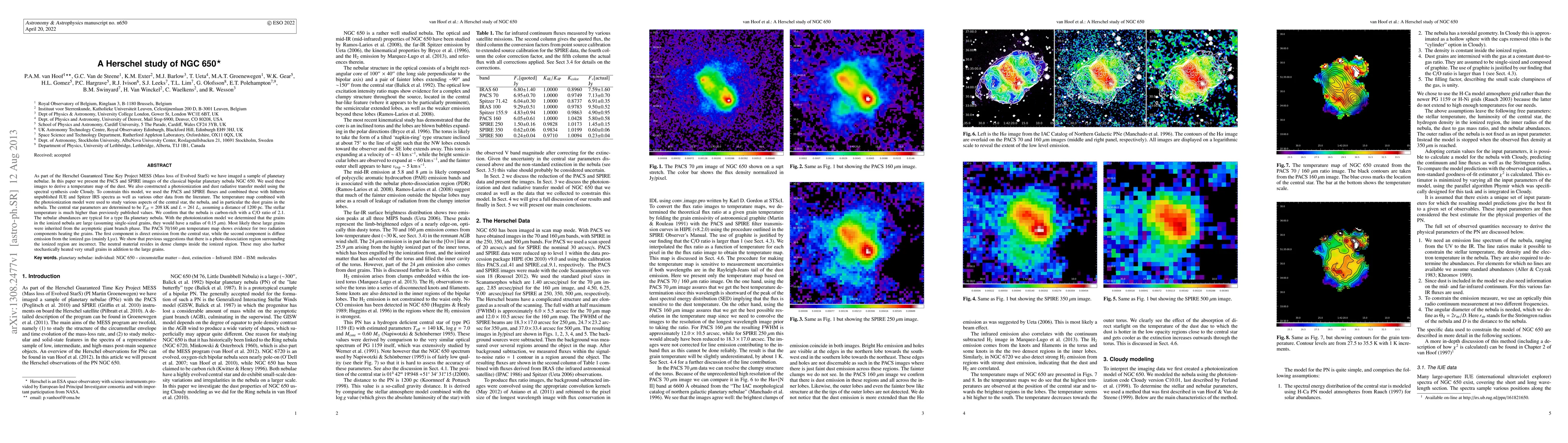 As part of the Herschel Guaranteed Time Key Project MESS (Mass loss of Evolved StarS) we have imaged a sample of planetary nebulae. In this paper we present the PACS and SPIRE images of the classical bipolar planetary nebula NGC 650. We used these images to derive a temperature map of the dust. We also constructed a photoionization and dust radiative transfer model using the spectral synthesis code Cloudy. To constrain this model, we used the PACS and SPIRE fluxes and combined these with hitherto unpublished IUE and Spitzer IRS spectra as well as various other data from the literature. The temperature map combined with the photoionization model were used to study various aspects of the central star, the nebula, and in particular the dust grains in the nebula. The central star parameters are determined to be T_eff = 208 kK and L = 261 L_sol assuming a distance of 1200 pc. The stellar temperature is much higher than previously published values. We confirm that the nebula is carbon-rich with a C/O ratio of 2.1. The nebular abundances are typical for a type IIa planetary nebula. With the photoionization model we determined that the grains in the ionized nebula are large (assuming single-sized grains, they would have a radius of 0.15 micron. Most likely these large grains were inherited from the asymptotic giant branch phase. The PACS 70/160 micron temperature map shows evidence for two radiation components heating the grains. The first component is direct emission from the central star, while the second component is diffuse emission from the ionized gas (mainly Ly alpha). We show that previous suggestions that there is a photo-dissociation region surrounding the ionized region are incorrect. The neutral material resides in dense clumps inside the ionized region. These may also harbor stochastically heated very small grains in addition to the large grains.