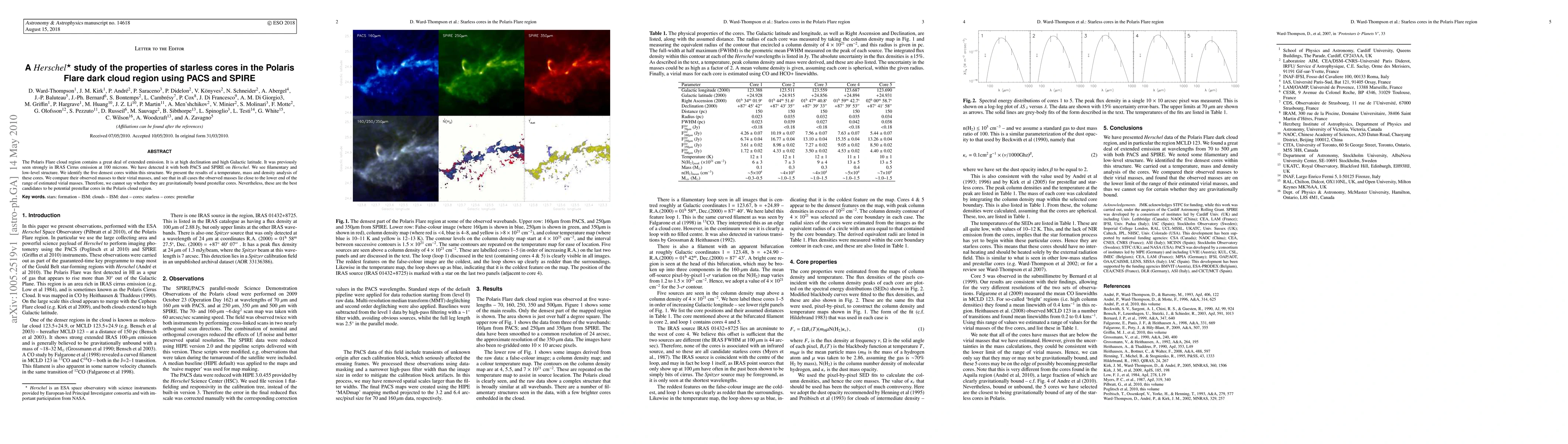 The Polaris Flare cloud region contains a great deal of extended emission. It is at high declination and high Galactic latitude. It was previously seen strongly in IRAS Cirrus emission at 100 microns. We have detected it with both PACS and SPIRE on Herschel. We see filamentary and low-level structure. We identify the five densest cores within this structure. We present the results of a temperature, mass and density analysis of these cores. We compare their observed masses to their virial masses, and see that in all cases the observed masses lie close to the lower end of the range of estimated virial masses. Therefore, we cannot say whether they are gravitationally bound prestellar cores. Nevertheless, these are the best candidates to be potentialprestellar cores in the Polaris cloud region.