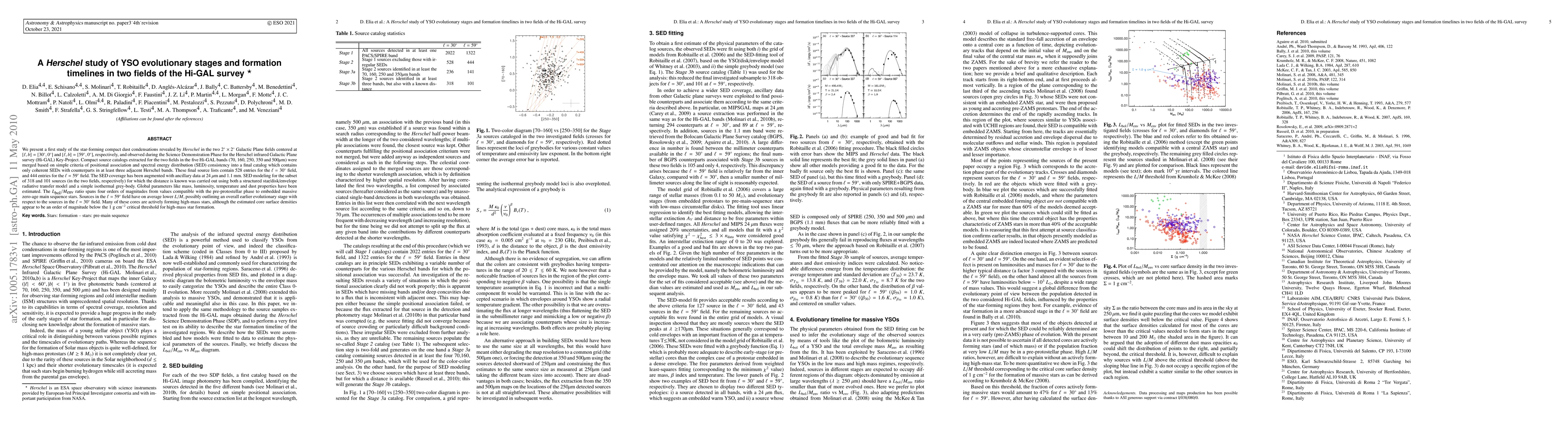 This Herschel study examines star-forming condensations in two Galactic Plane fields, resulting in a catalog of 528 and 444 sources for l = 30° and l = 59°, respectively. By modeling SEDs, the research estimates mass, luminosity, and temperature, revealing a wide range in Lbol/Menv ratios. Sources in the l = 59° field show lower L/M on average, suggesting an earlier evolutionary stage, while many cores indicate active high-mass star formation, despite surface densities being below critical thresholds.