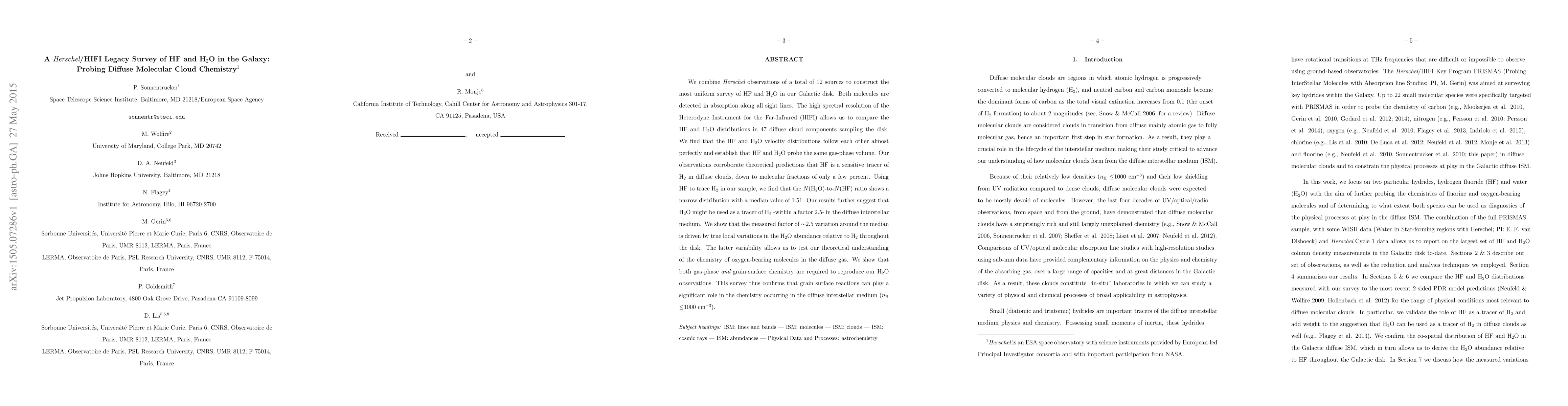 We combine Herschel observations of a total of 12 sources to construct the most uniform survey of HF and H2O in our Galactic disk. Both molecules are detected in absorption along all sight lines. The high spectral resolution of the Heterodyne Instrument for the Far-Infrared (HIFI) allows us to compare the HF and H2O distributions in 47 diffuse cloud components sampling the disk. We find that the HF and H2O velocity distributions follow each other almost perfectly and establish that HF and H2O probe the same gas-phase volume. Our observations corroborate theoretical predictions that HF is a sensitive tracer of H2 in diffuse clouds, down to molecular fractions of only a few percent. Using HF to trace H2 in our sample, we find that the N(H2O)-to-N(HF) ratio shows a narrow distribution with a median value of 1.51. Our results further suggest that H2O might be used as a tracer of H2 -within a factor 2.5- in the diffuse interstellar medium. We show that the measured factor of ~2.5 variation around the median is driven by true local variations in the H2O abundance relative to H2 throughout the disk. The latter variability allows us to test our theoretical understanding of the chemistry of oxygen-bearing molecules in the diffuse gas. We show that both gas-phase and grain-surface chemistry are required to reproduce our H2O observations. This survey thus confirms that grain surface reactions can play a significant role in the chemistry occurring in the diffuse interstellar medium n_H < 1000 cm^-3.