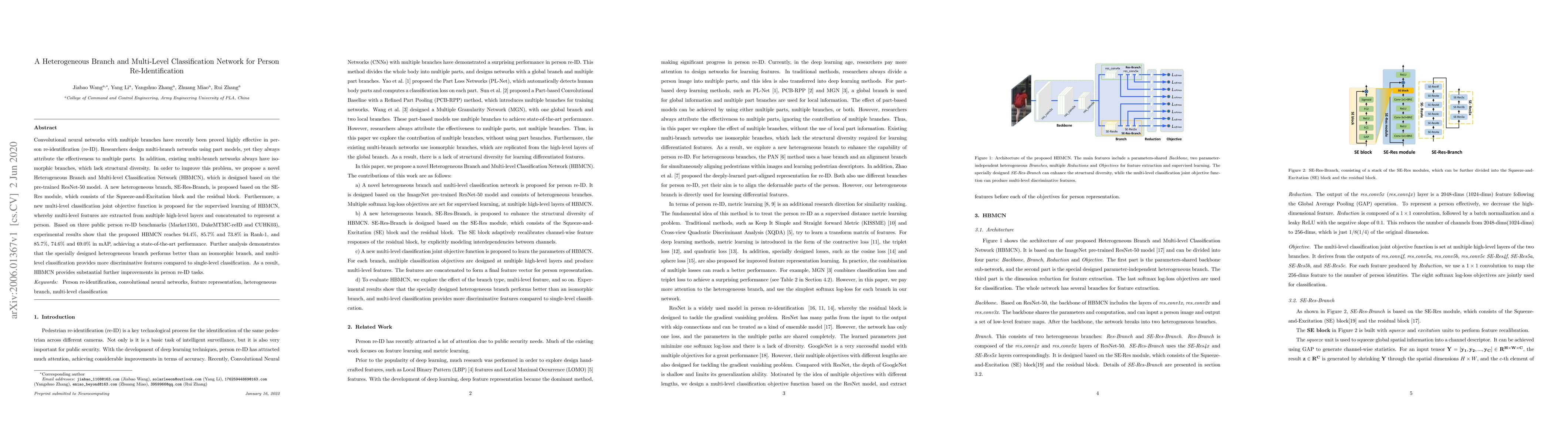This paper proposes a Heterogeneous Branch and Multi-level Classification Network (HBMCN) for person re-identification, featuring a novel SE-Res-Branch based on Squeeze-and-Excitation and residual blocks. The HBMCN achieves state-of-the-art performance on three benchmarks, demonstrating that its heterogeneous branch and multi-level classification approach extract more discriminative features than traditional isomorphic branches.
