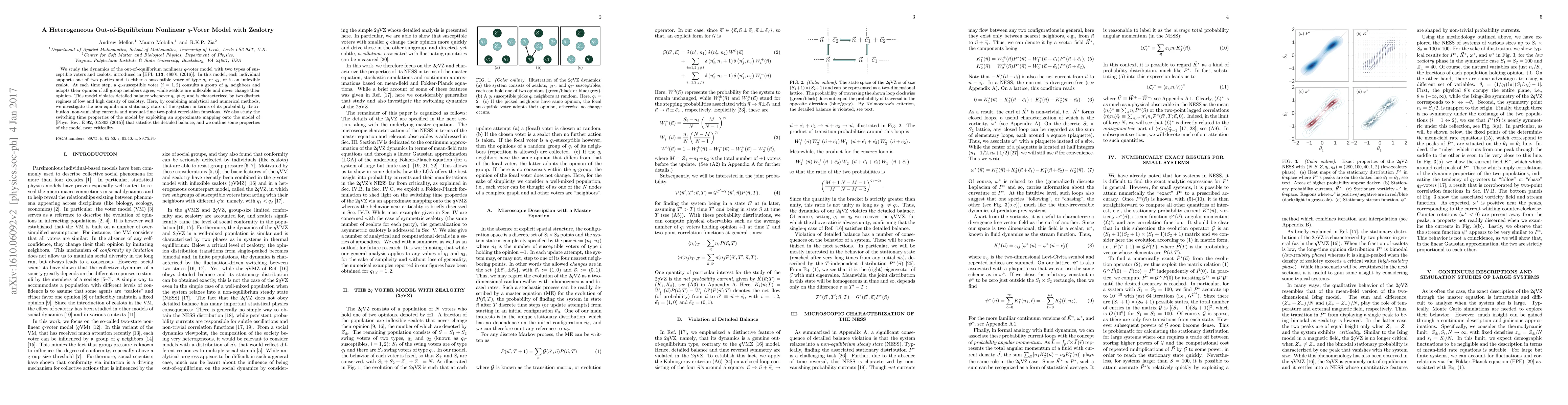 We study the dynamics of the out-of-equilibrium nonlinear q-voter model with two types of susceptible voters and zealots, introduced in [EPL 113, 48001 (2016)]. In this model, each individual supports one of two parties and is either a susceptible voter of type $q_1$ or $q_2$, or is an inflexible zealot. At each time step, a $q_i$-susceptible voter ($i = 1,2$) consults a group of $q_i$ neighbors and adopts their opinion if all group members agree, while zealots are inflexible and never change their opinion. This model violates detailed balance whenever $q_1 \neq q_2$ and is characterized by two distinct regimes of low and high density of zealotry. Here, by combining analytical and numerical methods, we investigate the non-equilibrium stationary state of the system in terms of its probability distribution, non-vanishing currents and unequal-time two-point correlation functions. We also study the switching times properties of the model by exploiting an approximate mapping onto the model of [Phys. Rev. E 92, 012803 (2015)] that satisfies the detailed balance, and also outline some properties of the model near criticality.