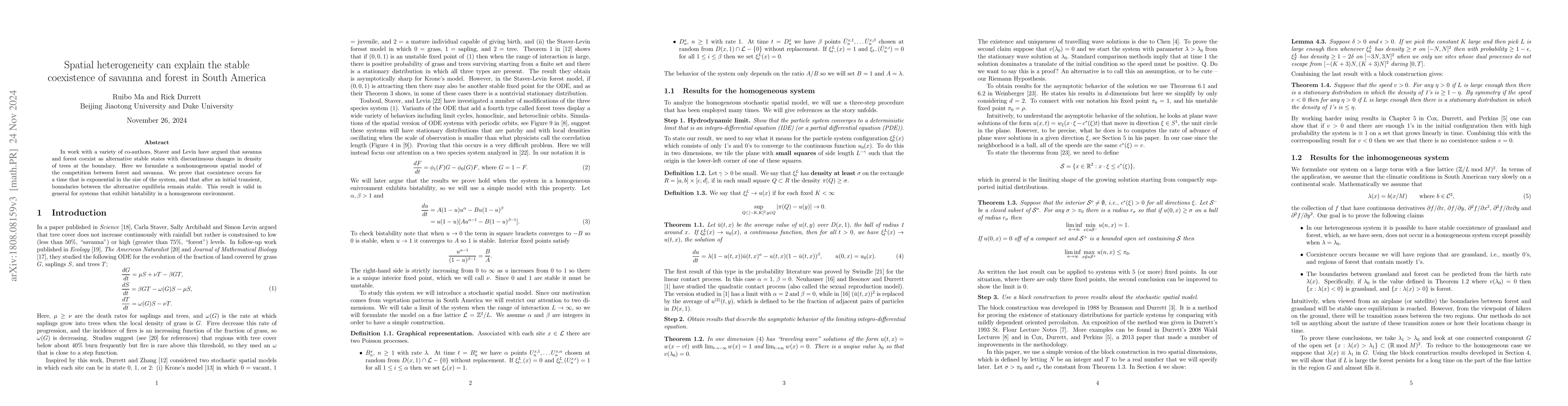 In work with a variety of co-authors, Staver and Levin have argued that savannah and forest coexist as alternative stable states with discontinuous changes in density of trees at the boundary. Here we formulate a nonhomogeneous spatial model of the competition between forest and savannah. We prove that coexistence occurs for a time that is exponential in the size of the system, and that after an initial transient, boundaries between the alternative equilibria remain stable.