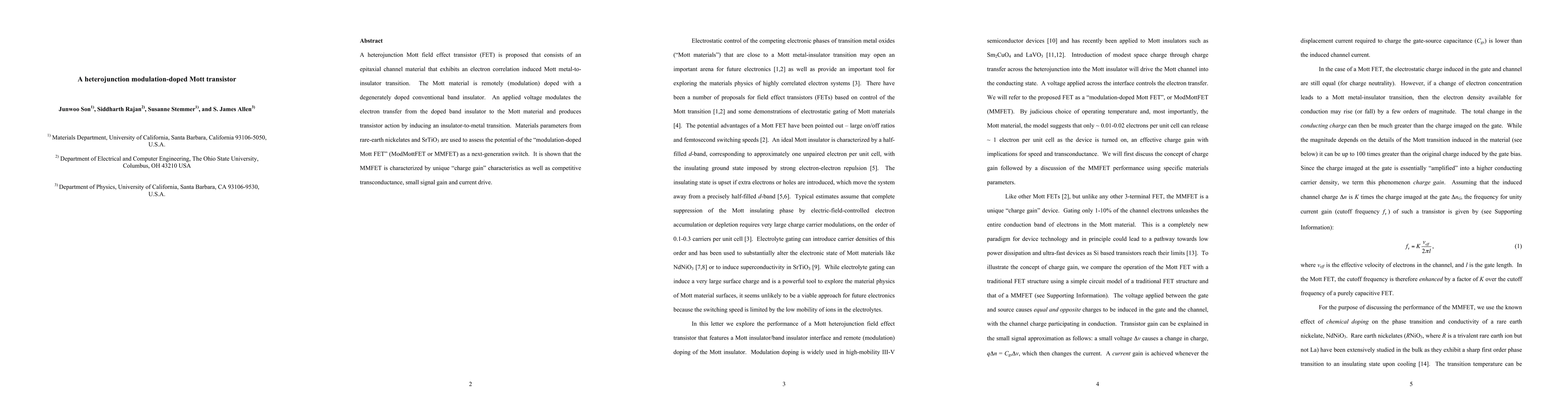 The paper proposes a heterojunction modulation-doped Mott transistor (ModMottFET) using an epitaxial channel material that undergoes a metal-to-insulator transition due to electron correlation. The device utilizes a modulation-doped band insulator to achieve transistor action through an insulator-to-metal transition, demonstrating unique charge gain characteristics and competitive performance metrics.