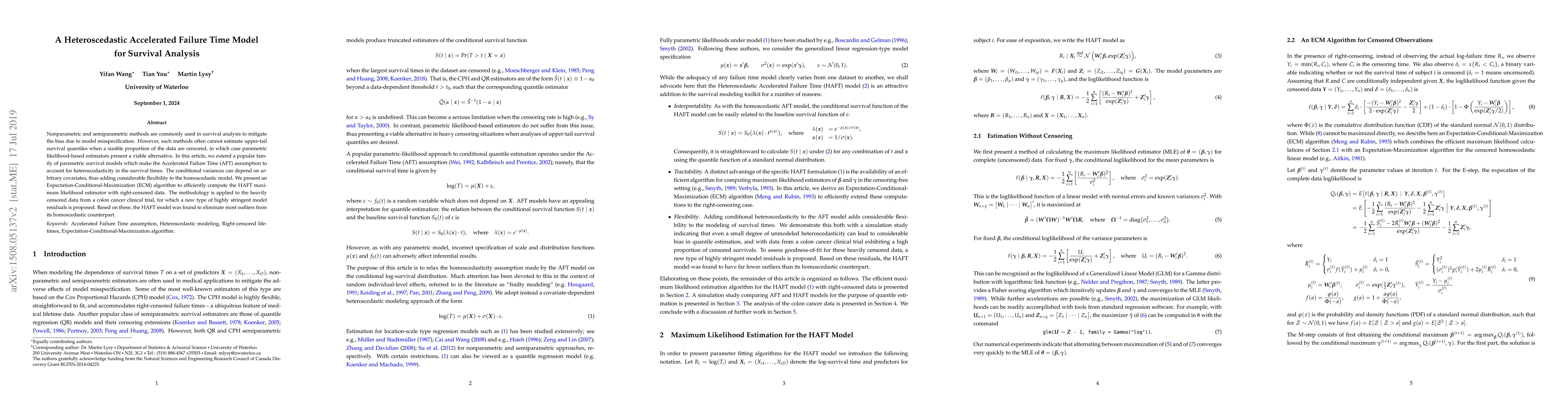 This paper proposes a heteroscedastic Accelerated Failure Time (HAFT) model for survival analysis, addressing heteroscedasticity in survival times and employing an Expectation-Conditional-Maximization algorithm for estimation. The HAFT model effectively reduces outliers compared to its homoscedastic counterpart, demonstrated through its application to a colon cancer clinical trial dataset.