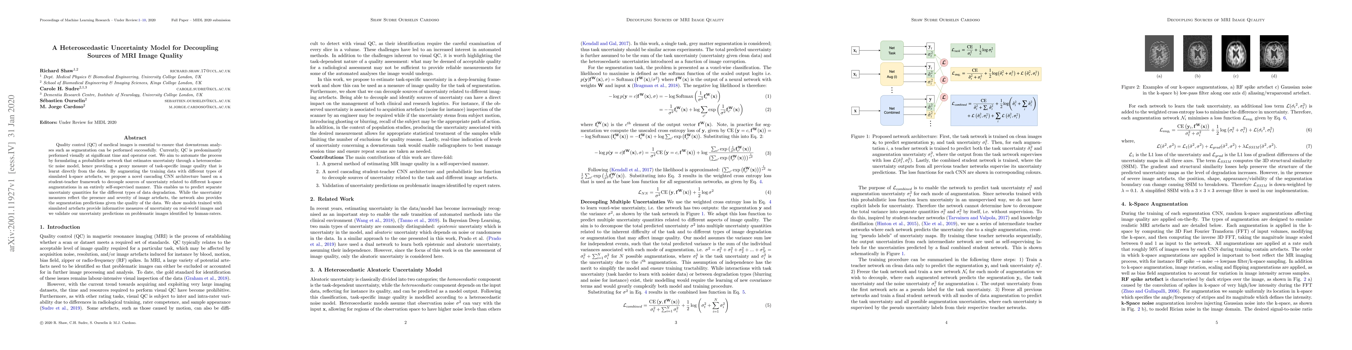 Quality control (QC) of medical images is essential to ensure that downstream analyses such as segmentation can be performed successfully. Currently, QC is predominantly performed visually at significant time and operator cost. We aim to automate the process by formulating a probabilistic network that estimates uncertainty through a heteroscedastic noise model, hence providing a proxy measure of task-specific image quality that is learnt directly from the data. By augmenting the training data with different types of simulated k-space artefacts, we propose a novel cascading CNN architecture based on a student-teacher framework to decouple sources of uncertainty related to different k-space augmentations in an entirely self-supervised manner. This enables us to predict separate uncertainty quantities for the different types of data degradation. While the uncertainty measures reflect the presence and severity of image artefacts, the network also provides the segmentation predictions given the quality of the data. We show models trained with simulated artefacts provide informative measures of uncertainty on real-world images and we validate our uncertainty predictions on problematic images identified by human-raters.