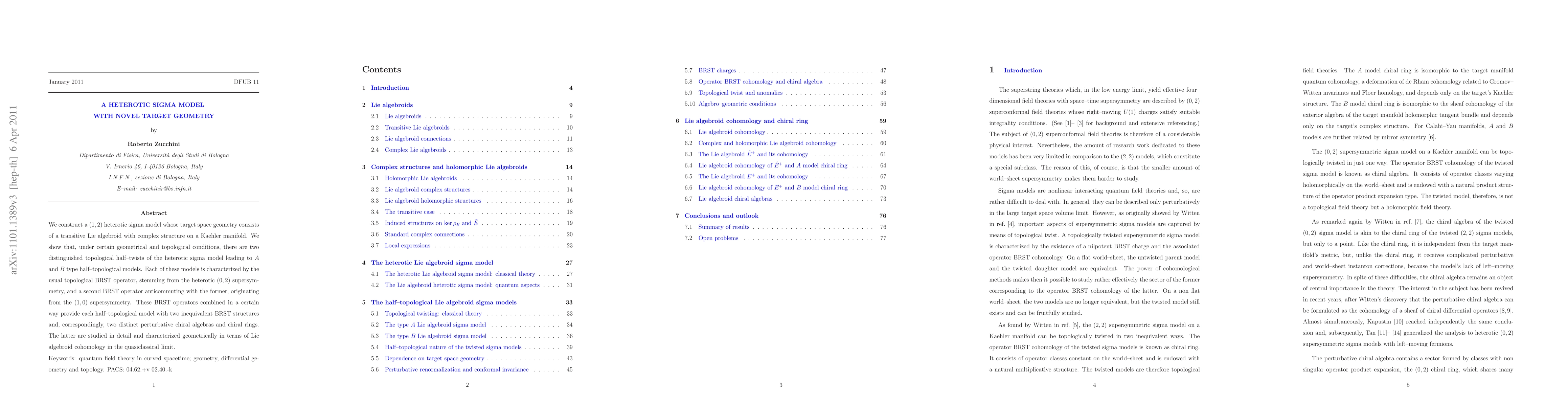 We construct a (1,2) heterotic sigma model whose target space geometry consists of a transitive Lie algebroid with complex structure on a Kaehler manifold. We show that, under certain geometrical and topological conditions, there are two distinguished topological half--twists of the heterotic sigma model leading to A and B type half--topological models. Each of these models is characterized by the usual topological BRST operator, stemming from the heterotic (0,2) supersymmetry, and a second BRST operator anticommuting with the former, originating from the (1,0) supersymmetry. These BRST operators combined in a certain way provide each half--topological model with two inequivalent BRST structures and, correspondingly, two distinct perturbative chiral algebras and chiral rings. The latter are studied in detail and characterized geometrically in terms of Lie algebroid cohomology in the quasiclassical limit.
